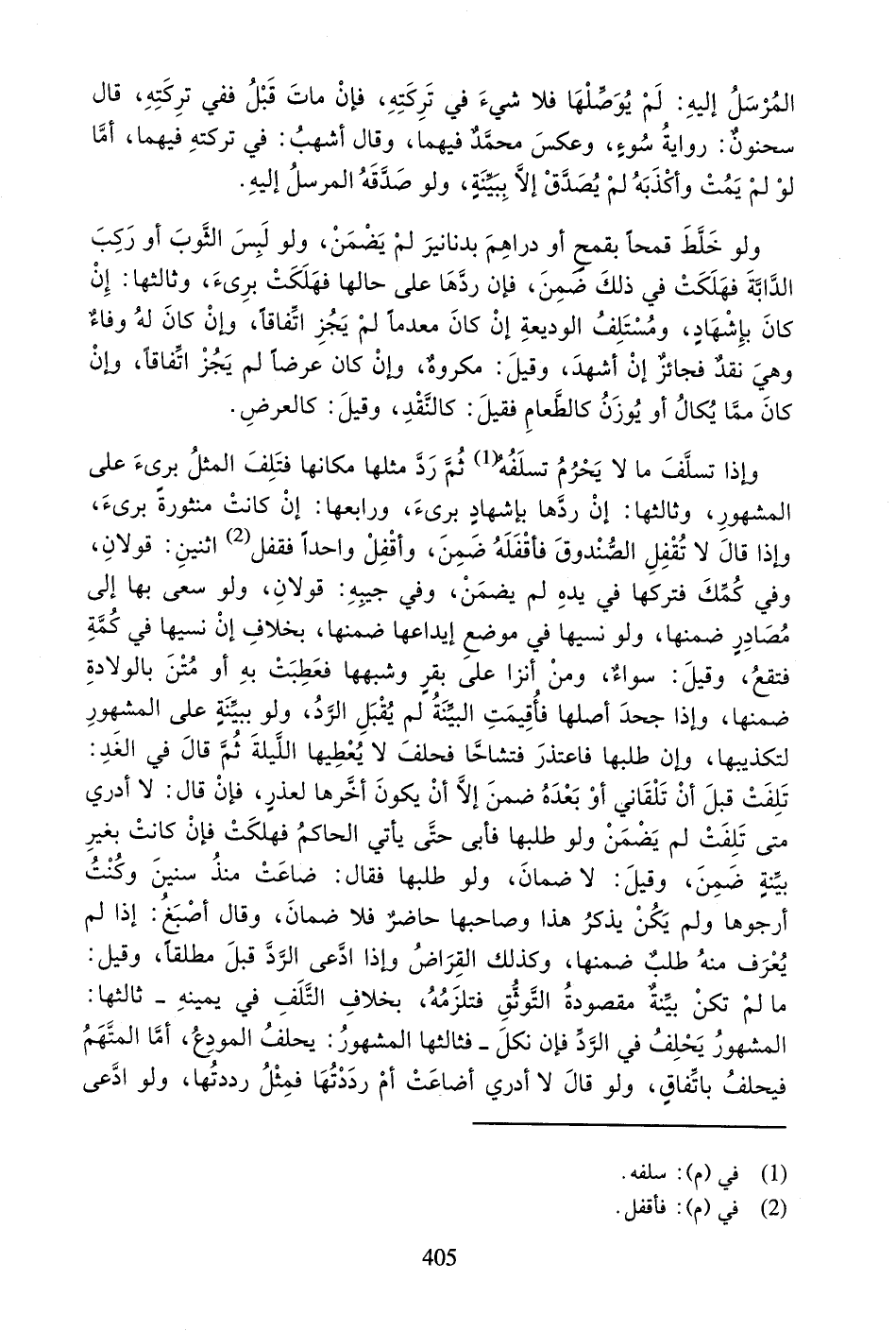 اثْنَيْنِ: قَوْلانِ، وَفِي كُمِّكَ فَتَرَكَهَا فِي يَدِهِ لَمْ يَضْمَنْ، وَفِي جَيْبِهِ: قَوْلانِ، وَلَوْ سَعَى بِهَا إِلَى مَصَادِرَ ضَمِنَهَا، وَلَوْ نَسِيَهَا فِي مَوْضِعِ إِيدَاعِهَا ضَمِنَهَا، بِخِلافِ إِنْ نَسِيَهَا فِي كُمِّهِ فَتَقَعُ، وَقِيلَ: سَوَاءٌ، وَمَنْ أَنْزَا عَلَى بَقَرٍ وَشِبْهِهَا فَعَطِبَتْ بِهِ أَوْ مُتْنُ بِالْوِلادَةِ ضَمِنَهَا، وَإِذَا جَحَدَ أَصْلَهَا فَأُقِيمَتِ الْبَيِّنَةُ لَمْ يُقْبَلِ الرَّدُّ، وَلَوْ بِبَيِّنَةٍ عَلَى الْمَشْهُورِ لِتَكْذِيبِهَا، وَإِنْ طَلَبَهَا فَاعْتَذَرَ فَتَشَاحَّا فَحَلَفَ لا يُعْطِيهَا اللَّيْلَةَ ثُمَّ قَالَ فِي الْغَدِ: تَلِفَتْ قَبْلَ أَنْ تَلْقَانِي أَوْ بَعْدَهُ ضَمِنَ إِلا أَنْ يَكُونَ أَخَّرَهَا لِعُذْرٍ، فَإِنْ قَالَ: لا أَدْرِي مَتَى تَلِفَتْ لَمْ يَضْمَنْ وَلَوْ طَلَبَهَا فَأَبَى حَتَّى يَأْتِيَ الْحَاكِمُ فَهَلَكَتْ فَإِنْ كَانَتْ بِغَيْرِ بَيِّنَةٍ ضَمِنَ، وَقِيلَ: لا ضَمَانَ، وَلَوْ طَلَبَهَا فَقَالَ: ضَاعَتْ مُنْذُ سِنِينَ وَكُنْتُ أَرْجُوهَا وَلَمْ يَكُنْ يَذْكُرُ هَذَا وَصَاحِبُهَا حَاضِرٌ فَلا ضَمَانَ، وَقَالَ أَصْبَغُ: إِذَا لَمْ يُعْرَفْ مِنْهُ طَلَبٌ ضَمِنَهَا، وَكَذَلِكَ الْقِرَاضُ وَإِذَا ادَّعَى الرَّدَّ قَبْلُ مُطْلَقاً، وَقِيلَ: مَا لَمْ تَكُنْ بَيِّنَةٌ مَقْصُودَةُ التَّوَثُّقِ فَتَلْزَمُهُ، بِخِلافِ التَّلَفِ فِي يَمِينِهِ - ثَالِثُهَا: الْمَشْهُورُ يَحْلِفُ فِي الرَّدِّ فَإِنْ نَكَلَ - فَثَالِثُهَا الْمَشْهُورُ: يَحْلِفُ الْمُودِعُ، أَمَّا الْمُتَّهَمُ فَيَحْلِفُ بِاتِّفَاقٍ، وَلَوْ قَالَ: لا أَدْرِي أَضَاعَتْ أُمّ رَدَدْتُهَا فَمِثْلُ رَدَدْتُهَا، وَلَوِ ادَّعَى