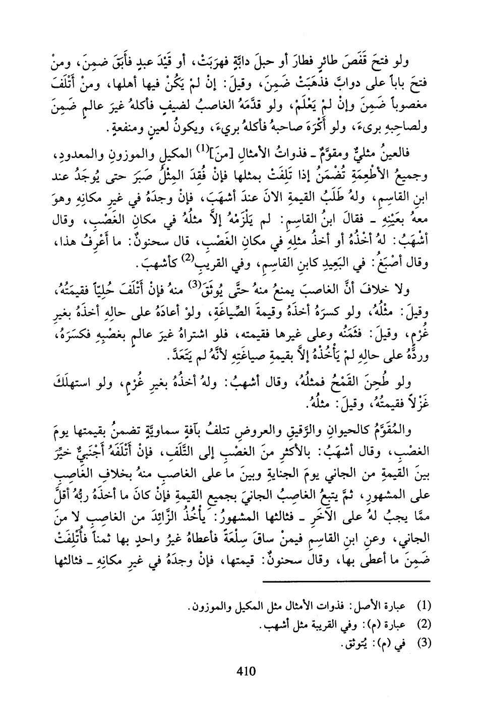 فَالْعَيْنُ مِثْلِيٌّ وَمُقَوَّمٌ - فَذَوَاتُ الأَمْثَالِ [مِنَ] الْمَكِيلِ وَالْمَوْزُونِ وَالْمَعْدُودِ، وَجَمِيعُ الأَطْعِمَةِ تُضْمَنُ إِذَا تَلِفَتْ بِمِثْلِهَا فَإِنْ فُقِدَ الْمِثْلُ صَبَرَ حَتَّى يُوجَدَ عِنْدَ ابْنِ الْقَاسِمِ، وَلَهُ طَلَبُ الْقِيمَةِ الآنَ عِنْدَ أَشْهَبَ، فَإِنْ وَجَدَهُ فِي غَيْرِ مَكَانِهِ وَهُوَ مَعَهُ بِعَيْنِهِ - فَقَالَ ابْنُ الْقَاسِمِ: لَمْ يَلْزَمْهُ إِلا مِثْلُهُ فِي مَكَانِ الْغَصْبِ، وَقَالَ أَشْهَبُ: لَهُ أَخْذُهُ أَوْ أَخْذُ مِثْلِهِ فِي مَكَانِ الْغَصْبِ، قَالَ سَحْنُونٌ: مَا أَعْرِفُ هَذَا، وَقَالَ أَصْبَغُ: فِي الْبَعِيدِ كَابْنِ الْقَاسِمِ، وَفِي الْقَرِيبِ كَأَشْهَبَ.