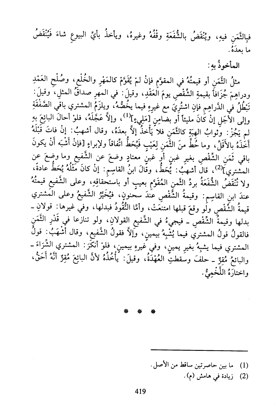 مِثْلُ الثَّمَنِ أَوْ قِيمَتِهِ فِي الْمُقَوَّمِ فَإِنْ لَمْ يُقَوَّمْ كَالْمَهْرِ وَالْخُلْعِ، وَصُلْحِ الْعَمْدِ وَدَرَاهِمَ جُزَافاً بِقِيمَةِ الشِّقْصِ يَوْمَ الْعَقْدِ، وَقِيلَ: فِي الْمَهْرِ صَدَاقُ الْمِثْلِ، وَقِيلَ: تَبْطُلُ فِي الدَّرَاهِمِ فَإِنِ اشْتُرِيَ مَعَ غَيْرِهِ فِيمَا يَخُصُّهُ، وَيَلْزَمُ الْمُشْتَرِيَ بَاقِي الصَّفْقَةِ وَإِلَى الأَجَلِ إِنْ كَانَ مَلِيئاً أَوْ بِضَامِنٍ [مَلِيءٍ]، وَإِلا عَجَّلَهُ، فَلَوْ أَحَالَ الْبَائِعُ بِهِ لَمْ يَجُزْ: وَثَوَابُ الْهِبَةِ كَالثَّمَنِ فَلا يَأْخُذُ إِلا بَعْدَهُ، وَقَالَ أَشْهَبُ: إِنْ فَاتَ قَبْلَهُ أَخَذَهُ بِالأَقَلِّ، وَمَا حُطَّ مِنَ الثَّمَنِ لِعَيْبٍ فَيُحَطُّ اتِّفَاقاً وَلإِبْرَاءٍ [فَإِنْ أَشْبَهَ أَنْ يَكُونَ بَاقِي ثَمَنِ الشِّقْصُ بِغَيْرِ غَبْنٍ أَوْ غَبْنٍ مُعْتَادٍ وُضِعَ عَنِ الشَّفِيعِ وَمَا وُضِعَ عَنِ الْمُشْتَرِي]، قَالَ أَشْهَبُ: يُحَطُّ، وَقَالَ ابْنُ الْقَاسِمِ: إِنْ كَانَ مِثْلَهُ يُحَطُّ عَادَةً، وَلا تُنْقَضُ الشُّفْعَةُ بِرَدِّ الثَّمَنِ الْمُقَوَّمِ بِعَيْبٍ أَوْ بِاسْتِحْقَاقِهِ، وَعَلَى الشَّفِيعِ قِيمَتُهُ عِنْدَ ابْنِ الْقَاسِمِ: وَقِيمَةُ الشِّقْصِ عِنْدَ سَحْنُونٍ، فَيُخَيَّرُ الشَّفِيعُ وَعَلَى الْمُشْتَرِي قِيمَةُ الشِّقْصِ وَلَوْ وَقَعَ قَبْلَهَا امْتَنَعَتْ، وَأَمَّا النُّقُودُ فَبَدَلُهَا، وَفِي غَيْرِهِا: قَوْلانِ - بَدَلُهَا وَقِيمَةُ الشِّقْصِ - فَيَجِيءُ فِي الشَّفِيعِ الْقَوْلانِ، وَلَوْ تَنَازَعَا فِي قَدْرِ الثَّمَنِ فَالْقَوْلُ قَوْلُ الْمُشْتَرِي فِيمَا يُشْبِهُ بِيَمِينٍ، وَإِلا فَقَوْلُ الشَّفِيعِ، وَقَالَ أَشْهَبُ: قَوْلُ الْمُشْتَرِي فِيمَا يُشْبِهُ بِغَيْرِ يَمِينٍ، وَفِي غَيْرِهِ بِيَمِينٍ، فَلَوْ