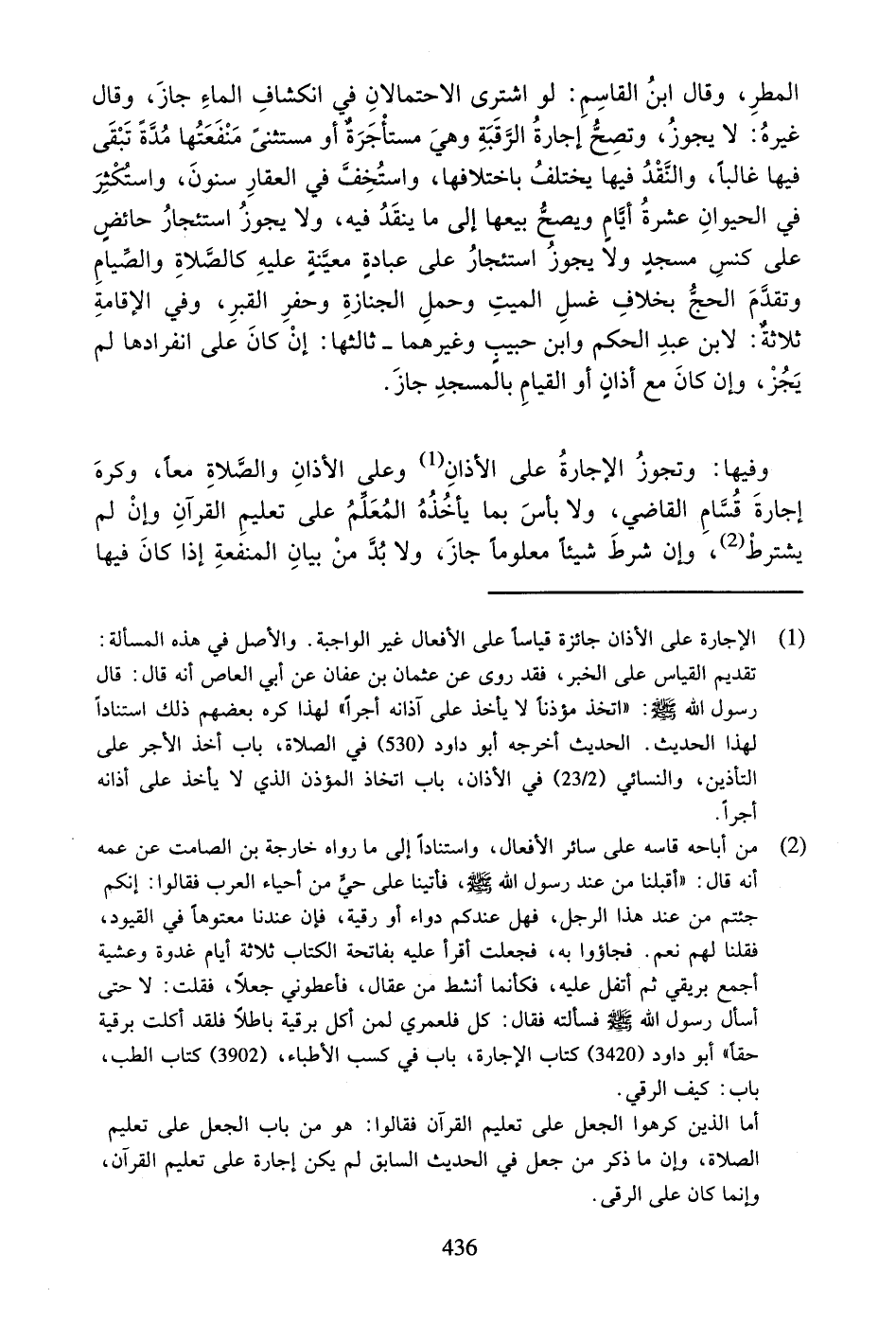 الْمَطَرِ، وَقَالَ ابْنُ الْقَاسِمِ: لَوِ اشْتَرَى الاحْتِمَالانِ فِي انْكِشَافِ الْمَاءِ جَازَ، وَقَالَ غَيْرُهُ: لا يَجُوزُ، وَتَصِحُّ إِجَارَةُ الرَّقَبَةِ وَهِيَ مُسْتَأْجَرَةٌ أَوْ مُسْتَثْنًى مَنْفَعَتُهَا مُدَّةً تَبْقَى فِيهَا غَالِباً، وَالنَّقْدُ فِيهَا يَخْتَلِفُ بِاخْتِلافِهَا، وَاسْتُخِفَّ فِي الْعَقَارِ سِنُونَ، وَاسْتُكْثِرَ فِي الْحَيَوَانِ عَشَرَةُ أَيَّامٍ وَيَصِحُّ بَيْعُهَا إِلَى مَا يُنْقَدُ فِيهِ، وَلا يَجُوزُ اسْتِئْجَارُ حَائِضٍ عَلَى كَنْسِ مَسْجِدٍ وَلا يَجُوزُ اسْتِئْجَارٌ عَلَى عِبَادَةٍ مُعَيَّنَةٍ عَلَيْهِ كَالصَّلاةِ وَالصِّيَامِ وَتَقَدَّمَ الْحَجُّ بِخِلافِ غُسْلِ الْمَيِّتِ وَحَمْلِ الْجِنَازَةِ وَحَفْرِ الْقَبْرِ، وَفِي الإِقَامَةِ ثَلاثَةٌ: لابْنِ عَبْدِ الْحَكَمِ وَابْنِ حَبِيبٍ وَغَيْرِهِمَا - ثَالِثُهَا: إِنْ كَانَ عَلَى انْفِرَادِهَا لَمْ يَجُزْ، وَإِنْ كَانَ مَعَ أَذَانٍ أَوِ الْقِيَامِ بِالْمَسْجِدِ جَازَ.