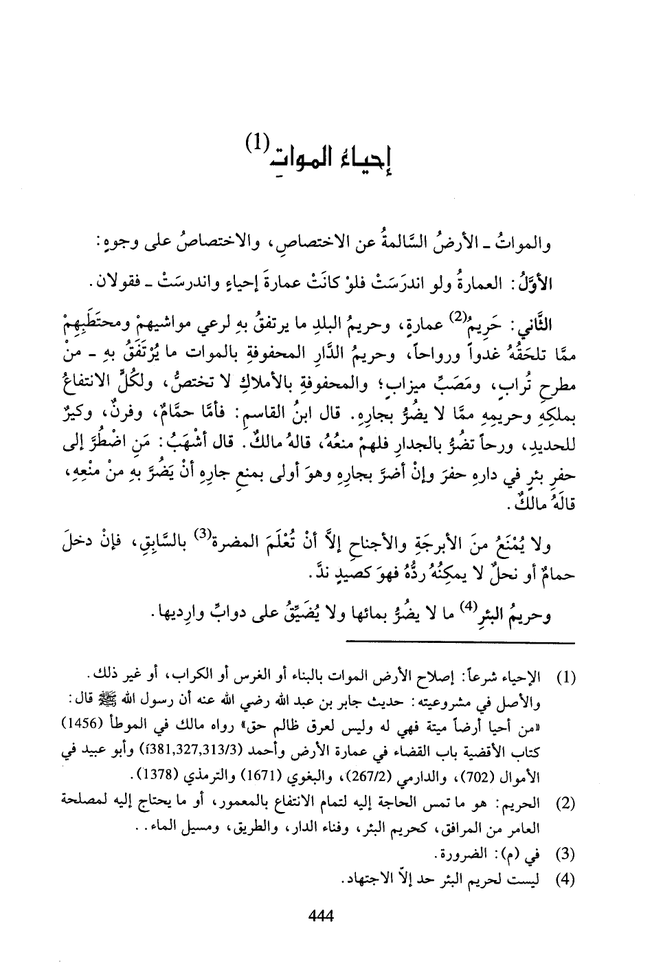 الثَّانِي: حَرِيمُ عِمَارَةٍ، وَحَرِيمُ الْبَلَدِ مَا يُرْتَفَقُ بِهِ لِرَعْيِ مَوَاشِيهِمْ وَمُحْتَطَبِهِمْ مِمَّا تَلْحَقُهُ غُدُوّاً وَرَوَاحاً، وَحَرِيمُ الدَّارِ الْمَحْفُوفَةِ بِالْمَوَاتِ مَا يُرْتَفَقُ بِهِ - مِنْ مَطْرَحِ تُرَابٍ، وَمَصَبِّ مِيزَابٍ؛ وَالْمَحْفُوفَةُ بِالأَمْلاكِ لا تَخْتَصُّ، وَلِكُلٍّ الانْتِفَاعُ بِمِلْكِهِ وَحَرِيمِهِ مِمَّا لا يَضُرُّ جَارَهُ. قَالَ ابْنُ الْقَاسِمِ: فَأَمَّا حَمَّامٌ، وَفُرْنٌ، وَكِيرٌ لِلْحَدِيدِ، وَرَحاً تَضُرُّ بِالْجِدَارِ فَلَهُمْ مَنْعُهُ، قَالَهُ مَالِكٌ. قَالَ أَشْهَبُ: مَنِ اضْطُرَّ إِلَى حَفْرِ بِئْرٍ فِي دَارِهِ حَفَرَ وَإِنْ أَضَرَّ بِجَارِهِ وَهُوَ أَوْلَى بِمَنْعِ جَارِهِ أَنْ يَضُرَّ بِهِ مِنْ مَنْعِهِ، قَالَهُ مَالِكٌ.