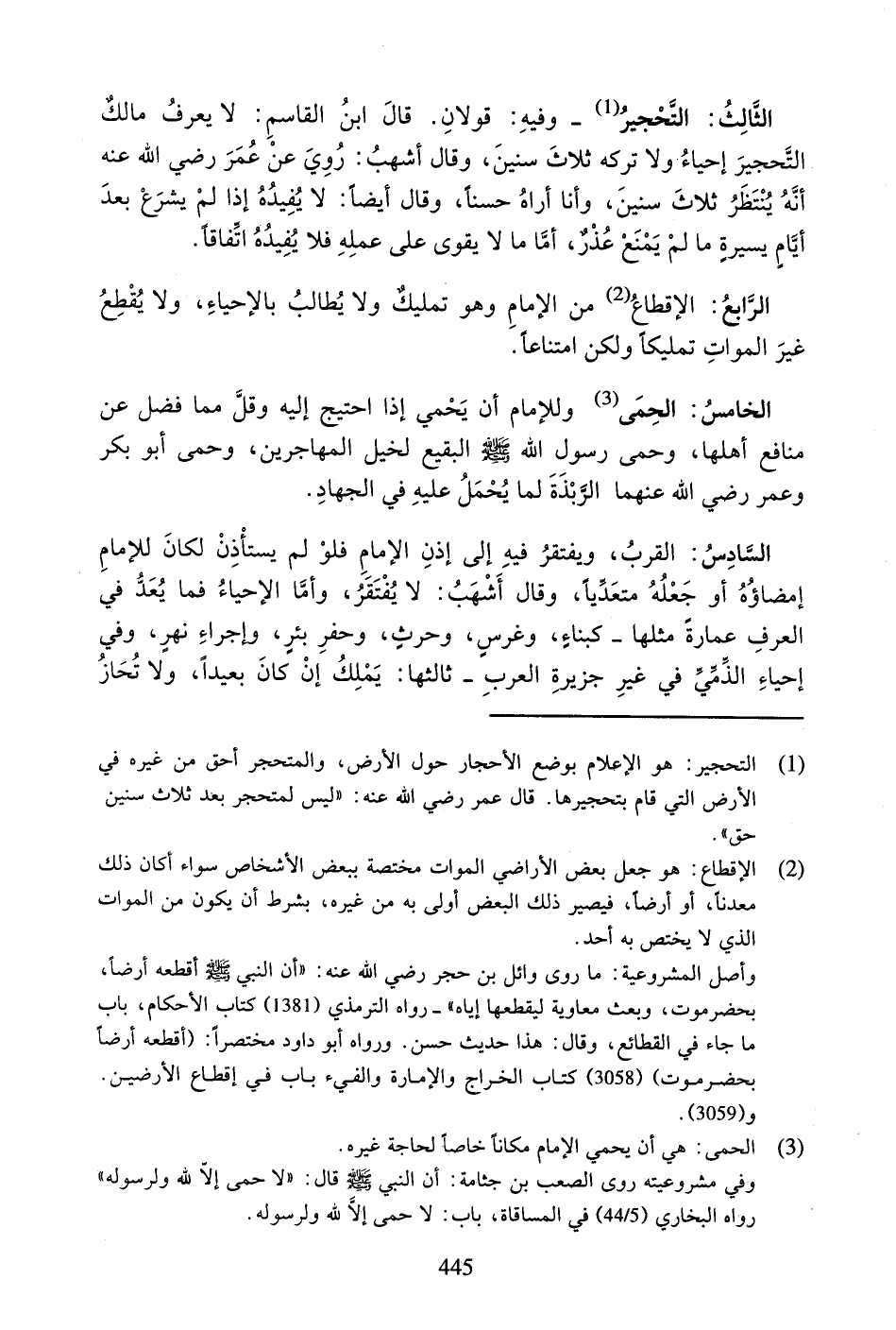 الْخَامِسُ: الْحِمَى وَلِلإِمَامِ أَنْ يَحْمِيَ إِذَا احْتِيجَ إِلَيْهِ وَقَلَّ مِمَّا فَضَلَ عَنْ مَنَافِعِ أَهْلِهَا، وَحَمَى رَسُولُ اللَّهِ صَلَّى اللَّهُ عَلَيْهِ وَسَلَّمَ الْبَقِيعَ لِخْيلِ الْمُهَاجِرِينَ، وَحَمَى أَبُو بَكْرٍ وَعُمَرُ رَضِيَ اللَّهُ عَنْهُمَا الرَّبَذَةَ لِمَا يُحْمَلُ عَلَيْهِ فِي الْجِهَادِ.