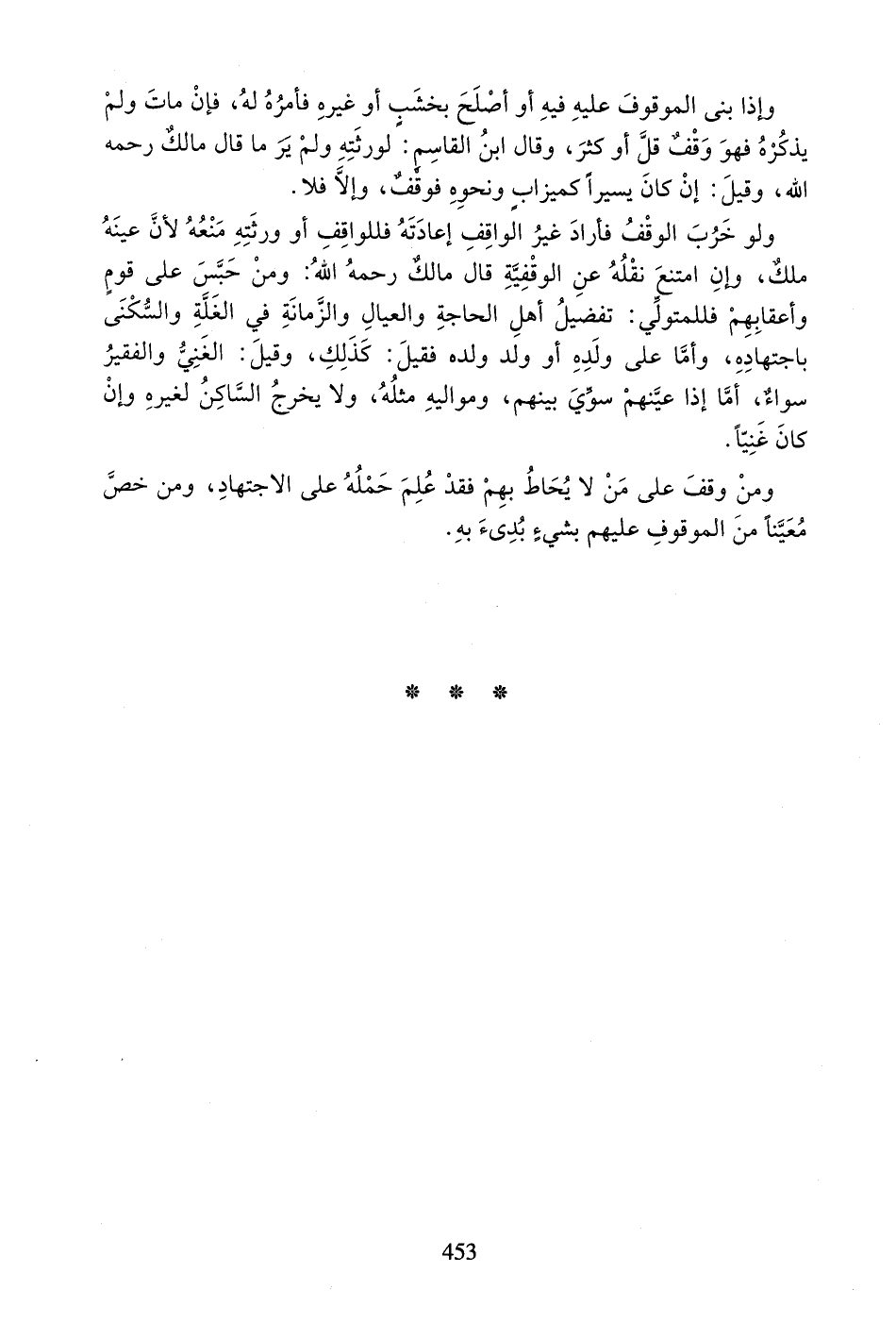 وَلَوْ خَرِبَ الْوَقْفُ فَأَرَادَ غَيْرُ الْوَاقِفِ إِعَادَتَهُ فَلِلْوَاقِفِ أَوْ وَرَثَتِهِ مَنْعُهُ لِأَّنَ عَيْنَهُ مِلْكٌ، وَإِنِ امْتَنَعَ نَقْلُهُ عَنِ الْوَقْفِيَّةِ قَالَ مَالِكٌ رَحِمَهُ اللَّهُ: وَمَنْ حَبَّسَ عَلَى قَوْمٍ وَأَعْقَابِهِمْ فَلِلْمُتَوَلِّي: تَفْضِيلُ أَهْلِ الْحَاجَةِ وَالْعِيالِ وَالزِّمَانَةِ فِي الْغَلَّةِ وَالسُّكْنَى بِاجْتِهَادِهِ، وَأَمَّا عَلَى وَلَدِهِ أَوْ وَلَدِ وَلَدِهِ فَقِيلَ: كَذَلِكَ، وَقِيلَ: الْغَنِيُّ وَالْفَقِيرُ سَوَاءٌ، أَمَّا إِذَا عَيَّنَهُمْ سُوِّيَ بَيْنَهُمْ، وَمَوَالِيهِ مِثْلُهُ، وَلا يَخْرُجُ السَّاكِنُ لِغَيْرِهِ وَإِنْ كَانَ غَنِيّاً.