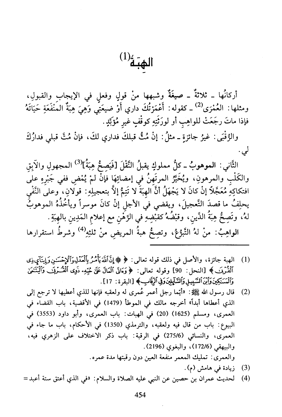 أأَرْكَانُهَا - ثَلاثَةٌ - صِيغَةٌ وَشِبْهُهَا مِنْ قَوْلٍ وَفِعْلٍ فِي الإِيجَابِ وَالْقَبُولِ، وَمِثْلُهَا: الْعُمْرَى - كَقَوْلِهِ: أَعْمَرْتُكَ دَارِي أَوْ ضَيْعَتِي وَهِيَ هِبَةُ الْمَنْفَعَةِ حَيَاتَهُ فَإِذَا مَاتَ رَجَعَتْ لِلْوَاهِبِ أَوْ لِوَرَثَتِهِ كَوَقْفٍ غَيْرِ مُؤَبَّدٍ.