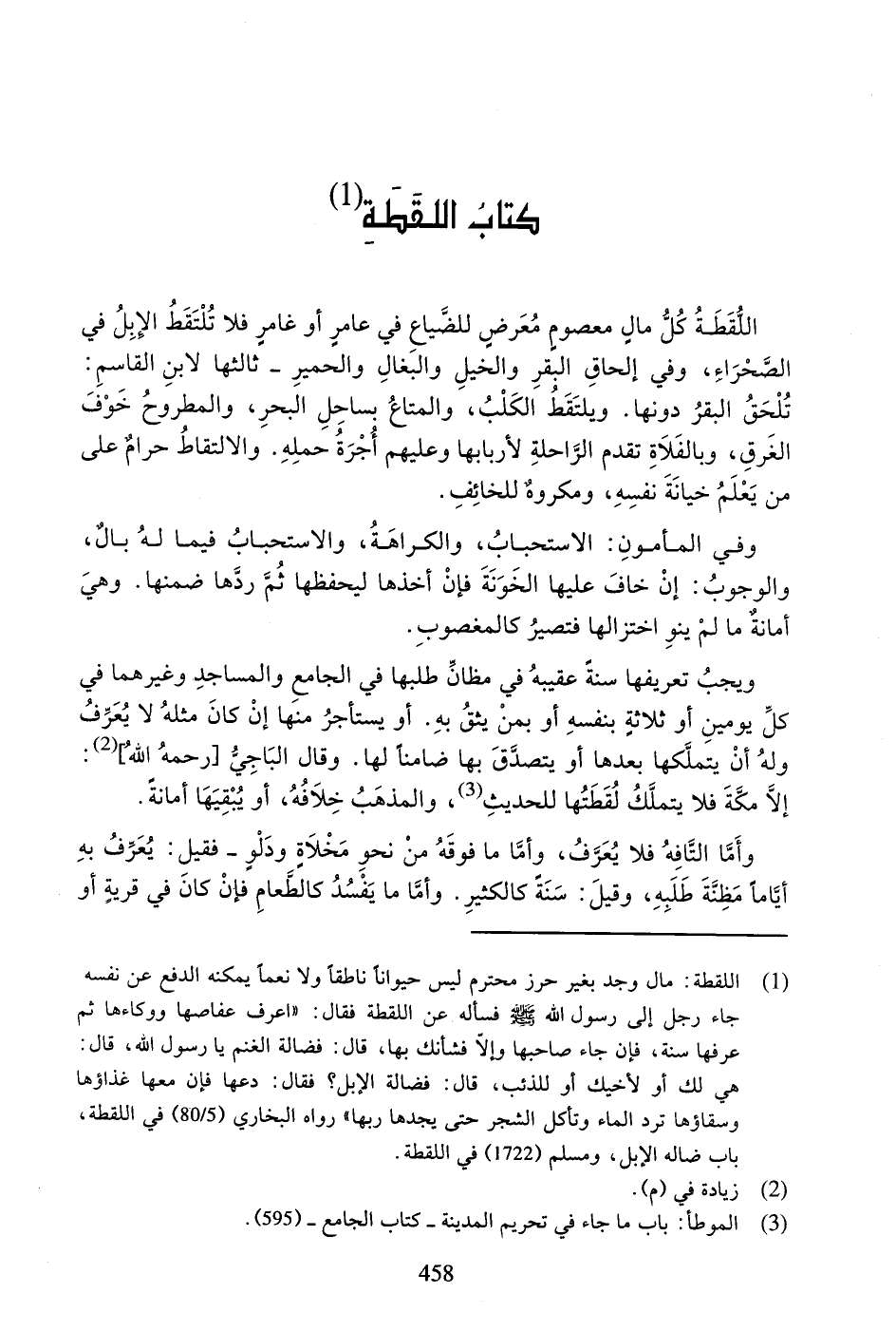 اللُّقَطَةُ كُلُّ مَالٍ مَعْصُومٍ مُعَرَّضٍ لِلضَّيَاعِ فِي عَامِرٍ أَوْ غَامِرٍ فَلا تُلْتَقَطُ الإِبِلُ فِي الصَّحْرَاءِ، وَفِي إِلْحَاقِ الْبَقَرِ وَالْخَيْلِ وَالْبِغَالِ وَالْحَمِيرِ - ثَالِثُهَا لابْنِ الْقَاسِمِ: تُلْحَقُ الْبَقَرُ دُونَهَا. وَيُلْتَقَطُ الْكَلْبُ، وَالْمَتَاعُ بِسَاحِلِ الْبَحْرِ، وَالْمَطْرُوحُ خَوْفَ الْغَرَقِ، وَبِالْفَلاةِ تُقَدَّمُ الرَّاحِلَةُ لأَرْبَابِهَا وَعَلَيْهِمْ أُجْرَةُ حَمْلِهِ. وَالالْتِقَاطُ حَرَامٌ عَلَى مَنْ يَعْلَمُ خِيَانَةَ نَفْسِهِ، وَمَكْرُوهٌ لِلْخَائِفِ.