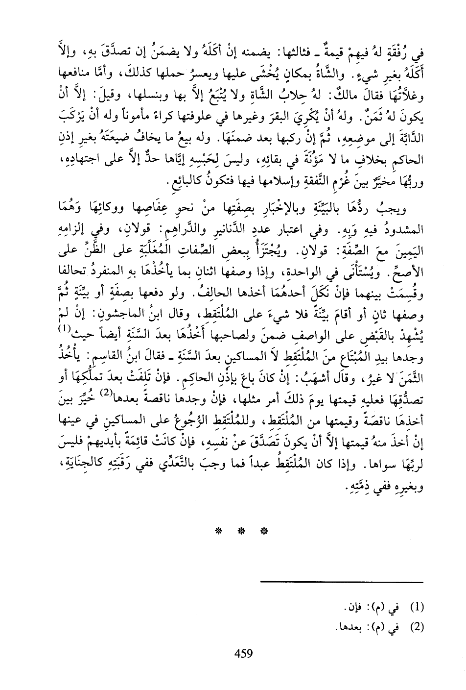 فِي رُفْقَةٍ لَهُ فِيهِمْ قِيمَةٌ - فَثَالِثُهَا: يَضْمَنُهُ إِنْ أَكَلَهُ وَلا يَضْمَنُ إِنْ تَصَدَّقَ بِهِ، وَإِلا أَكَلَهُ بِغَيْرِ شَيْءٍ. وَالشَّاةُ بِمَكَانٍ يُخْشَى عَلَيْهَا وَيَعْسُرُ حَمْلُهَا كَذَلِكَ، وَأَمَّا مَنَافِعُهَا وَغَلاتُهَا فَقَالَ مَالِكٌ: لَهُ حِلابُ الشَّاةِ وَلا يُتْبَعُ إِلا بِهَا وَبِنَسْلِهَا، وَقِيلَ: إِلا أَنْ يَكُونَ لَهُ ثَمَنٌ. وَلَهُ أَنْ يُكْرِيَ الْبَقَرَ وَغَيْرَهَا فِي عُلُوفَتِهَا كِرَاءً مَأْمُوناً وَلَهُ أَنْ يَرْكَبَ الدَّابَّةَ إِلَى مَوْضِعِهِ، ثُمَّ إِنْ رَكِبَهَا بَعْدُ ضَمِنَهَا. وَلَهُ بَيْعُ مَا يَخَافُ ضَيْعَتَهُ بِغَيْرِ إِذْنِ الْحَاكِمِ بِخِلافِ مَا لا مُؤْنَةَ فِي بَقَائِهِ، وَلَيْسَ لِحَبْسِهِ إِيَّاهَا حَدٌّ إِلا عَلَى اجْتِهَادِهِ، وَربُّهَا مُخَيَّرٌ بَيْنَ غُرْمِ النَّفَقَةِ وَإِسْلامِهَا فِيهَا فَتَكُونُ كَالْبَائِعِ.