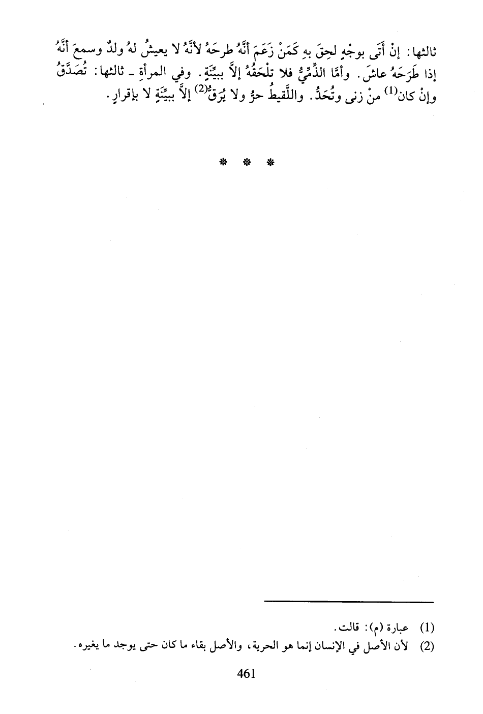 ثَالِثُهَا: إِنْ أَتَى بِوَجْهٍ لَحِقَ بِهِ كَمَنْ زَعَمَ أَنَّهُ طَرَحَهُ لأَنَّهُ لا يَعِيشُ لَهُ وَلَدٌ وَسَمِعَ أَنَّهُ إِذَا طَرَحَهُ عَاشَ. وَأَمَّا الذِّمِّيُّ فَلا تَلْحَقُهُ إِلا بِبَيِّنَةٍ. وَفِي الْمَرْأَةِ - ثَالِثُهَا: تُصَدَّقُ وَإِنْ كَانَ (2) مِنْ زِنًى وَتُحَدُّ. وَاللَّقِيطُ حُرٌّ وَلا يُرَقُّ إِلا بِبَيِّنَةٍ لا بِإِقْرَارٍ.