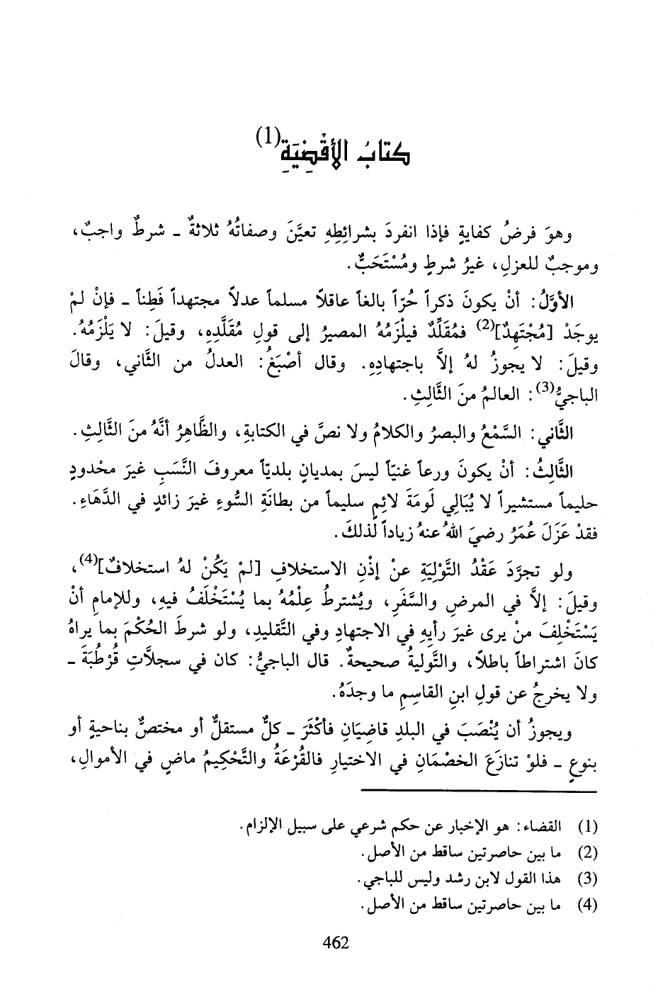 وَهُوَ فَرْضُ كِفَايَةٍ فَإِذَا انْفَرَدَ بِشَرَائِطِهِ تَعَيَّنَ وَصِفَاتُهُ ثَلاثَةٌ - شَرْطٌ وَاجِبٌ، وَمُوجِبٌ لِلْعَزْلِ، غَيْرُ شَرْطٍ وَمُسْتَحَبٌّ.