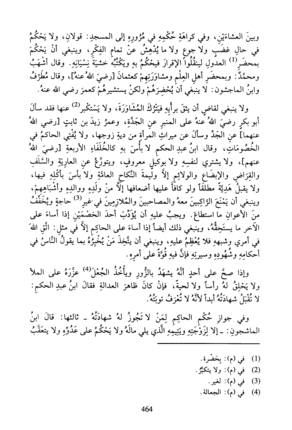 وَبيْنَ الْعِشَاءَيْنِ، وَفِي كَرَاهَةِ حُكْمِهِ فِي مُرُورِهِ إِلَى الْمَسْجِدِ: قَوْلانِ، وَلا يَحْكُمُ فِي حَالِ غَضَبٍ وَلا جُوعٍ وَلا مَا يُدْهِشُ عَنْ تَمَامِ الْفِكْرِ، وَيَنْبِغِي أَنْ يَحْكُمَ بِمَحضَرِ (¬1) الْعُدُولِ لِيَنْقُلُوا الإِقْرَارَ فَيَحْكُمُ بِهِ وَيَكْتُبُهُ خَشْيَةَ نِسْيَانِهِ. وَقَالَ أَشْهَبُ وَمُحَمَّدٌ: وَبِمَحْضَرِ أَهْلِ الْعِلْمِ وَمُشَاوَرَتِهِمْ كَعُثْمَانَ [رَضِيَ اللَّهُ عَنْهُ]، وَقَالَ مُطَرِّفٌ وَابْنُ الْمَاجِشُونِ: لا يَنْبَغِي أَنْ يُحْضِرَهُمْ وَلَكِنْ يَسْتَشِيرُهُمْ كَعُمَرَ رَضِيَ اللَّهُ عَنْهُ.