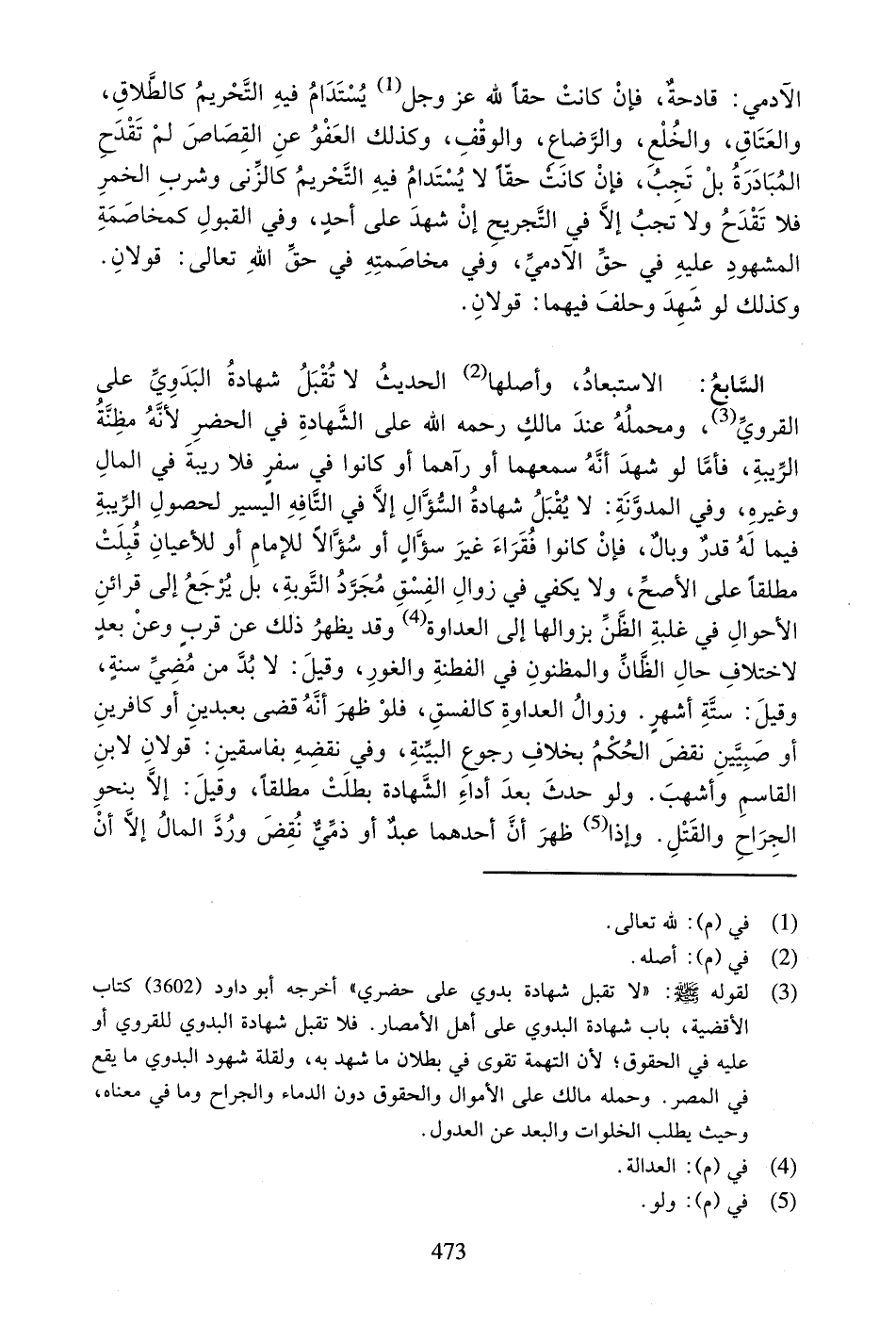 السَّابِعُ: الاسْتِبْعَادُ، وَأَصْلُهُا (¬2) الْحَدِيثُ لا تُقْبَلُ شَهَادَةُ الْبَدَوِيِّ عَلَى الْقَرَوِيِّ، وَمَحْمَلُهُ عِنْدَ مَالِكٍ رَحِمَهُ اللَّهُ عَلَى الشَّهَادَةِ فِي الْحَضَرِ لأَنَّهُ مَظِنَّةُ الرِّيبَةِ، فَأَمَّا لَوْ شَهِدَ أَنَّهُ سَمِعَهُمَا أَوْ رَآهُمَا أَوْ كَانُوا فِي سَفَرٍ فَلا رِيبَةَ فِي الْمَالِ وَغَيْرِهِ، وَفِي الْمُدَوَّنَةِ: لا يُقْبَلُ شَهَادَةُ السُّؤَّالِ إِلا فِي التَّافِهِ الَيَسِيرِ لِحُصُولِ الرِّيبَةِ فِيمَا لَهُ قَدْرٌ وَبَالٌ، فَإِنْ كَانُوا فُقَرَاءَ غَيْرَ سُؤَّالٍ أَوْ سُؤَّالاً لِلإِمَامِ أَوْ لِلَأْعَيَانِ قُبِلَتْ مُطْلَقاً عَلَى الأَصَحِّ، وَلا يَكْفِي فِي زَوَالِ الْفِسْقِ مُجَرَّدُ التَّوْبَةِ، بَلْ يُرْجَعُ إِلَى قَرَائِنِ الأَحْوَالِ فِي غَلَبَةِ الظَّنِّ بِزَوَالِهَا إِلَى الْعَدَاوَةِ (¬3) وَقَدْ يَظْهَرُ ذَلِكَ عَنْ قُرْبٍ وَعَنْ بُعْدٍ لاخْتِلافِ حَالِ الظَّانِّ وَالْمَظْنُونِّ فِي الْفِطْنَةِ وَالْغَوْرِ، وَقِيلَ: لا بُدَّ مِنْ مُضِيِّ سَنَةٍ، وَقِيلَ: سِتَّةُ أَشْهُرٍ. وَزَوَالُ الْعَدَاوَةِ كَالْفِسْقِ، فَلَوْ ظَهَرَ أَنَّهُ قَضَى بِعَبْدَيْنِ أَوْ كَافِرَيْنِ أَوْ صَبِيَّيْنِ نَقَضَ الْحُكْمُ بِخِلافِ رُجُوعِ الْبَيِّنَةِ، وَفِي نَقْضِهِ بِفَاسِقَيْنِ: قَوْلانِ لابْنِ الْقَاسِمِ وَأَشْهَبَ. وَلَوْ حَدَثَ بَعْدَ أَدَاءِ الشَّهَادَةِ بَطَلَتْ مُطْلَقاً، وَقِيلَ: إِلا بِنَحْوِ الْجِرَاحِ وَإِذَا (¬4)