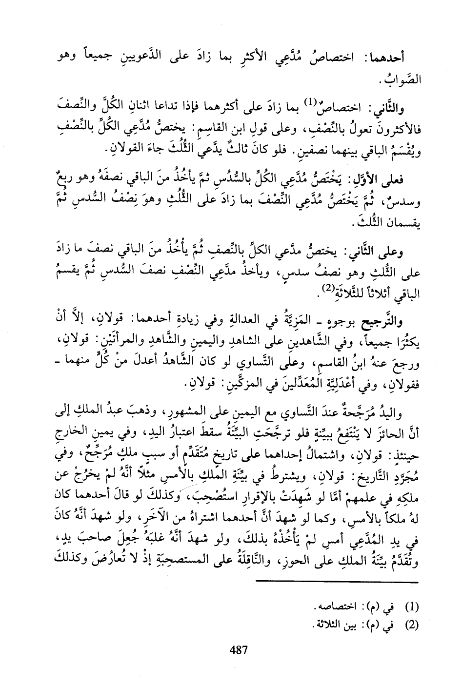 وَالثَّانِي: اخْتِصَاصٌ (¬1) بِمَا زَادَ عَلَى أَكْثَرِهِمَا فَإِذَا تَدَاعَا اثْنَانِ الْكُلَّ وَالنِّصْفَ فَالأَكْثَرُونَ تَعُولُ بِالنِّصْفِ، وَعَلَى قَوْلِ ابْنِ الْقَاسِمِ: يَخْتَصُّ مُدَّعِي الْكُلِّ بِالنِّصْفِ وَيُقْسَمُ الْبَاقِي بَيْنَهُمَا نِصْفَيْنِ. فَلَوْ كَانَ ثَالِثٌ يَدَّعِي الثُّلُثَ جَاءَ الْقَوْلانِ.