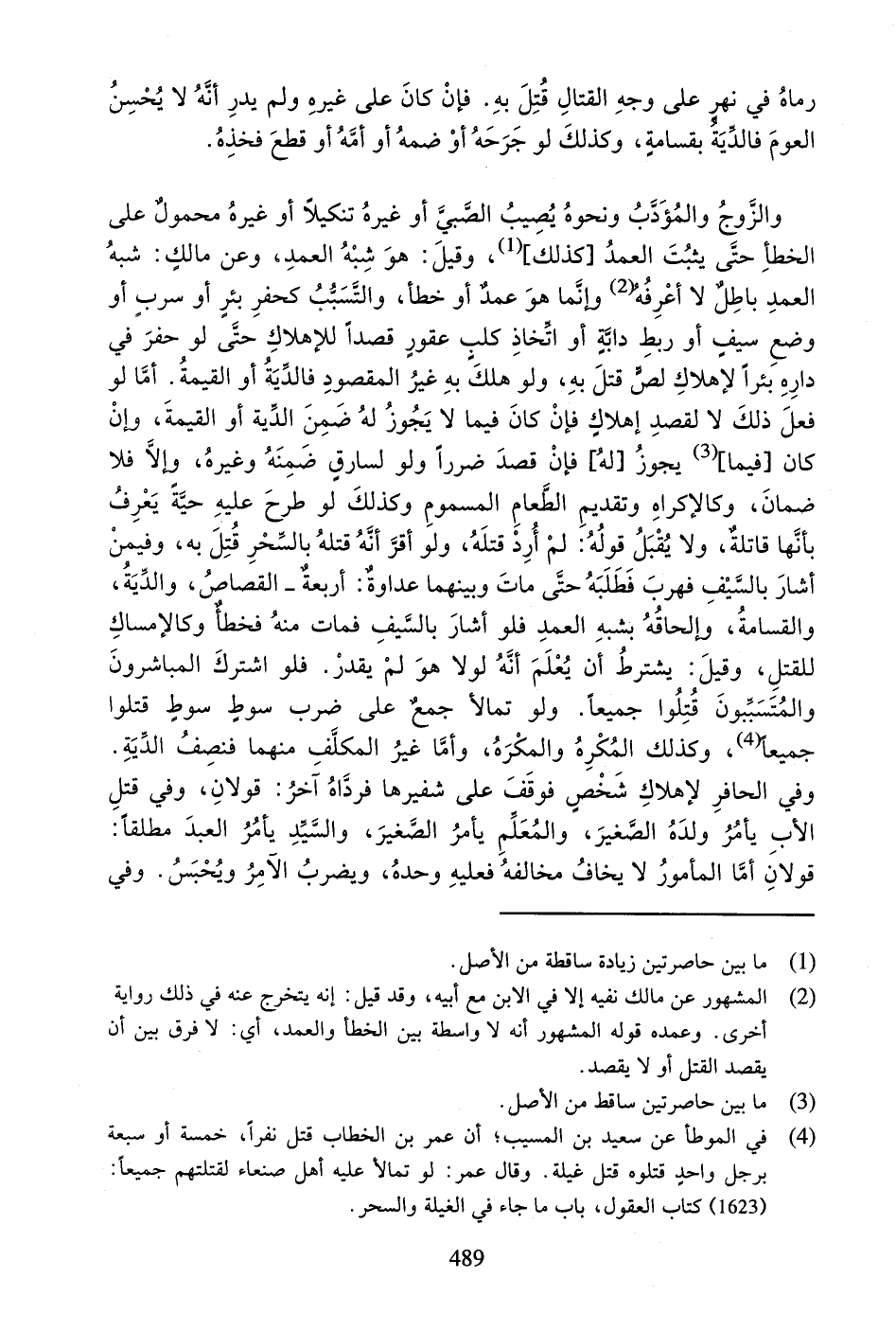 وَالزَّوْجُ وَالْمُؤَدِّبُ وَنَحْوُهُ يُصِيبُ الصَّبِيَّ أَوْ غَيْرَهُ مَحْمُولٌ عَلَى الْخَطَأِ حَتَّى يَثْبُتَ الْعَمْدُ [كَذَلِكَ]، وَقِيلَ: هُوَ شِبْهُ الْعَمْدِ، وَعَنْ مَالِكٍ: شِبْهُ الْعَمْدِ بِاطِلٌ لا أَعْرِفُهُ وَإِنَّمَا هُوَ عَمْدٌ أَوْ خَطَأٌ، وَالتَّسَبُّبُ كَحَفْرِ بِئْرٍ أَوْ سَرْبٍ أَوْ وَضْعِ سَيْفٍ أَوْ رَبْطِ دَابَّةٍ أَوِ اتْخَاذِ كَلْبٍ عَقُورٍ قَصْداً لِلإِهْلاكِ حَتَّى لَوْ حَفَرَ فِي دَارِهِ بِئْراً لِإِهْلاكِ لِصٍ قُتِلَ بِهِ، وَلَوْ هَلَكَ بِهِ غَيْرُ الْمَقْصُودِ فَالدِّيَةُ أَوِ الْقِيمَةُ. أَمَّا لَوْ فَعَلَ ذَلِكَ لا لِقَصْدِ إِهْلاكٍ فَإِنْ كَانَ فِيمَا لا يَجُوزُ لَهُ ضَمِنَ الدِّيَةَ أَوِ الْقِيمَةَ، وَإِنْ كَانَ [فِيمَا] يَجُوزُ [لَهُ] فَإِنْ قَصَدَ ضَرَراً وَلَوْ لِسَارِقٍ ضَمِنَهُ وَغَيْرَهُ، وَإِلا فَلا ضَمَانَ، وَكَالإِكْرَاهِ وَتَقْدِيمِ الطَّعَامِ الْمَسْمُومِ وَكَذَلِكَ لَوْ طَرَحَ عَلَيْهِ حَيَّةً يَعْرِفُ بِأَنَّهَا قَاتِلَةٌ، وَلا يُقْبَلُ قَوْلُهُ: لَمْ أُرِدْ قَتْلَهُ، وَلَوْ أَقَرَّ أَنَّهُ قَتَلَهُ بِالسِّحْرِ قُتِلَ بِهِ، وَفِيمَنْ أَشَارَ بِالسَّيْفِ فَهَرَبَ فَطَلَبَهُ حَتَّى مَاتَ وَبَيْنَهُمَا عَدَاوَةٌ: أَرْبَعَةٌ - الْقِصَاصُ، وَالدِّيَةُ، وَالْقَسَامَةُ، وَإِلْحَاقُهُ بِشِبْهِ الْعَمْدِ فَلَوْ أَشَارَ بِالسَّيْفِ فَمَاتَ مِنْهُ فَخَطَأٌ وَكَالإِمْسَاكِ لِلْقَتْلِ، وَقِيلَ: يُشْتَرَطُ أَنْ يَعْلَمَ أَنَّهُ لَوْلا هُوَ لَمْ يَقْدِرْ. فَلَوِ اشْتَرَكَ الْمُبَاشِرُونَ وَالْمُتَسَبِّبُونَ قُتِلُوا جَمِيعاً.