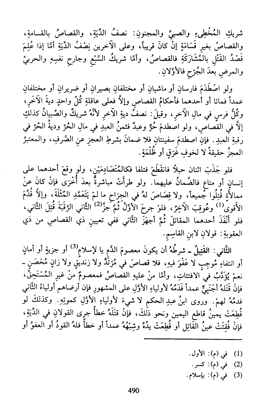 شَرِيكِ الْمُخْطِئِ وَالصَّبِيِّ وَالْمَجْنُونِ: نِصْفُ الدِّيَةِ، وَالْقِصَاصُ بِالْقَسَامَةِ، وَالْقِصَاصُ بِغَيْرِ قَسَامَةٍ إِنْ كَانَ قَرِيباً، وَعَلَى الآخَرِينَ نِصْفُ الدِّيَةِ أَمَّا إِذَا عُلِمَ قَصْدُ الْقَتْلِ بِالْمُشَارَكَةِ فَالْقِصَاصُ، وَأَمَّا شَرِيكُ السَّبْعِ وَجَارِحِ نَفْسِهِ وَالْحَرْبِيِّ وَالْمَرَضِ بَعْدَ الْجُرْحِ فَالأَوَّلانِ.