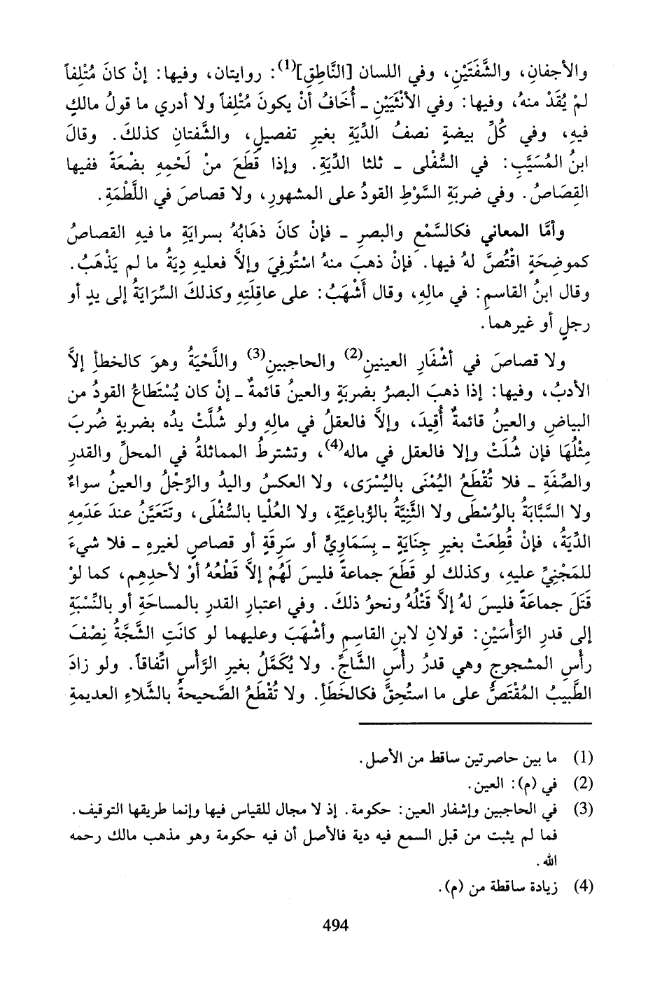 وَلا قِصَاصَ فِي أَشْفَارِ الْعَيْنَيْنِ (¬1) وَالْحَاجِبَيْنِ وَاللِّحْيَةِ وَهُوَ كَالْخَطَأِ إِلا الأَدَبَ، وَفِيهَا: إِذَا ذَهَبَ الْبَصَرُ بِضَرْبَةٍ وَالْعَيْنُ قَائِمَةٌ - إِنْ كَانَ يُسْتَطَاعُ الْقَوَدُ مِنَ الْبَيَاضِ، وَالْعَيْنُ قَائِمَةٌ أُقِيدَ، وَإِلا فَالْعَقْلُ فِي مِالِهِ وَلَوْ شُلَّتْ يَدُهُ بِضَرْبَةٍ ضُرِبَ مِثْلَهَا فَإِنْ شُلَّتْ وَإِلا فَالْعَقْلُ فِي مَالِهِ، وَتُشْتَرَطُ الْمُمَاثَلَةُ فِي الْمَحَلِّ وَالْقَدْرِ وَالصِّفَةِ - فَلا تُقْطَعُ الْيُمْنَى بِالْيُسْرَى، وَلا الْعَكْسُ وَالْيَدُ وَالرِّجْلُ وَالْعَيْنُ سَوَاءٌ وَلا السَّبَّابَةُ بِالْوُسْطَى وَلا الثَّنِيَّةُ بِالرُّبَاعِيَّةِ، وَلا الْعُلْيَا بِالسُّفْلَى، وَتَتَعَيَّنُ عِنْدَ عَدَمِهِ الدِّيَةُ، فَإِنْ قُطِعَتْ بِغَيْرِ جِنَايَةٍ - بِسَمَاوِيٍّ أَوْ سَرِقَةٍ أَوْ قِصَاصٍ لِغَيْرِهِ - فَلا شَيْءَ لِلْمَجْنِيِّ عَلَيْهِ، وَكَذَلِكَ لَوْ قَطَعَ جَمَاعَةً فَلَيْسَ لَهُمْ إِلا قَطْعُهُ أَوْ لأَحَدِهِمْ، كَمَا لَوْ قَتَلَ جَمَاعَةً فَلَيْسَ لَهُ إِلا قَتْلُهُ وَنَحْوُ ذَلِكَ. وَفِي اعْتِبَارِ الْقَدْرِ بِالْمِسَاحَةِ أَوْ بِالنِّسْبَةِ إِلَى قَدْرِ الرَّأْسَيْنِ: قَوْلانِ لابْنِ الْقَاسِمِ وَأَشْهَبَ وَعَلَيْهِمَا لَوْ كَانَتِ الشَّجَّةُ نِصْفَ رَأْسِ الْمَشْجُوجِ وَهِيَ قَدْرُ رَأْسِ الشَّاجِّ. وَلا يُكَمَّلُ بِغَيْرِ الرَّأْسِ اتِّفَاقاً. وَلَوْ زَادَ الطَّبِيبُ الْمُقْتَصُّ عَلَى مَا اسْتُحِقَّ فَكَالْخَطَأِ. وَلا تُقْطَعُ الصَّحِيحُةُ بِالشَّلاءِ الْعَدِيمَةِ