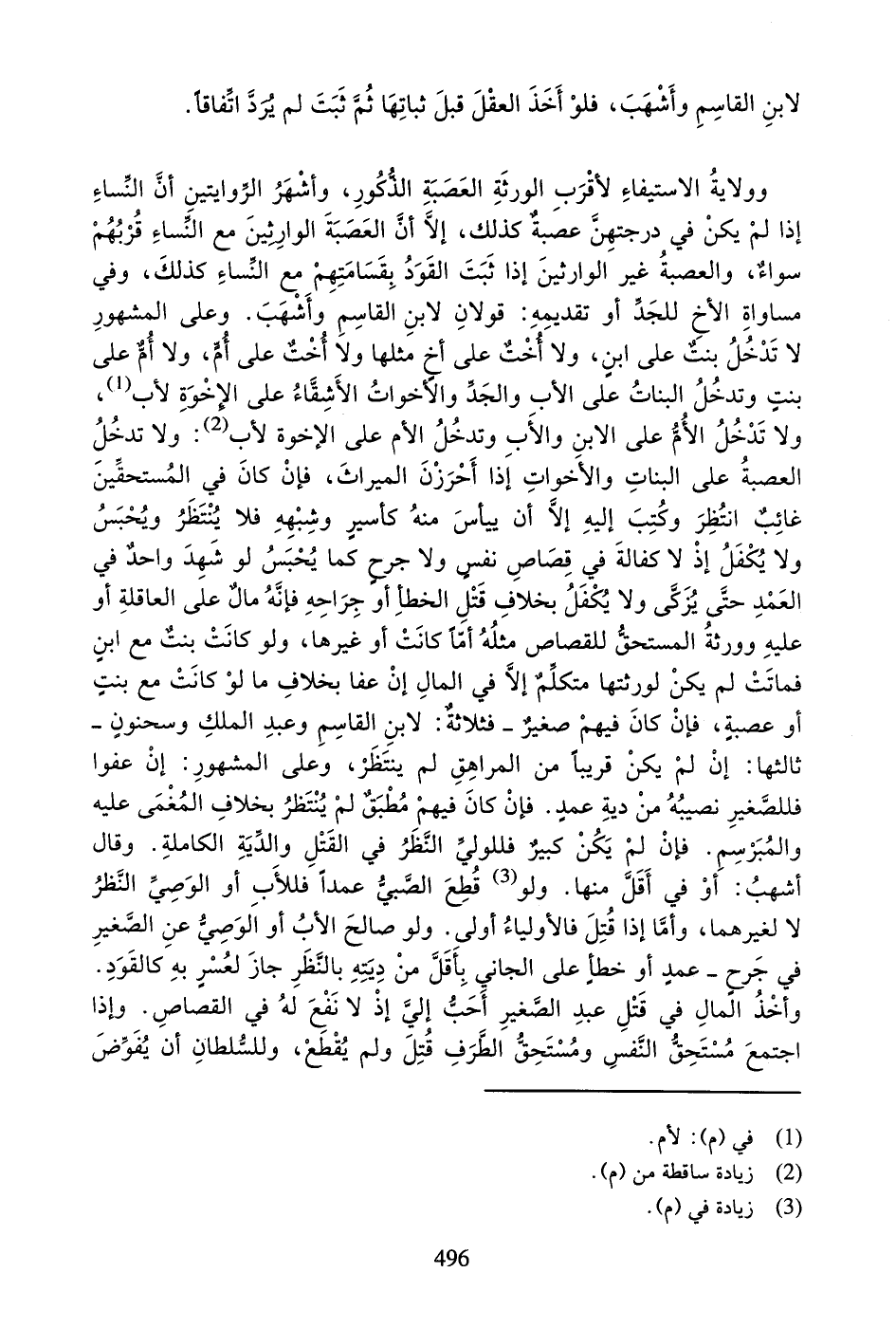 وَلا تَدْخُلُ الأُمُّ عَلَى الابْنِ وَالأَبِ وَتَدْخُلُ الأُمُّ عَلَى الإِخْوَةِ لأَبٍ: وَلا تَدْخُلُ الْعَصَبَةُ عَلَى الْبَنَاتِ وَالأَخَواتِ إِذَا أَحْرَزْنَ الْمِيرَاثَ، فَإِنْ كَانَ فِي الْمُسْتَحِقِّينَ غَائِبٌ انْتُظِرَ وَكُتِبَ إِلَيْهِ إِلا أَنْ يَيْأَسَ مِنْهُ كَأَسِيرٍ وَشِبْهِهِ فَلا يُنْتَظَرُ وَيُحْبَسُ وَلا يُكْفَلُ إِذْ لا كَفَالَةَ فِي قِصَاصِ نَفْسٍ وَلا جَرْحٍ كَمَا يُحْبَسُ لَوْ شَهِدَ وَاحِدٌ فِي الْعَمْدِ حَتَّى يُزَكَّى وَلا يُكْفَلُ بِخِلافِ الْخَطَأِ أَوْ جِرَاحِهِ فَإِنَّهُ مَالٌ عَلَى الْعَاقِلَةِ أَوْ عَلَيْهِ وَوَرَثَةُ الْمُسْتَحِقِّ لِلْقِصَاصِ مِثْلُهُ أَمَّا كَانَتْ أَوْ غَيْرَهُا، وَلَوْ كَانَتْ بِنْتٌ مَعَ ابْنِ فَمَاتَتْ لَمْ يَكُنْ لِوَرَثَتِهَا مُتَكَلِّمٌ إِلا فِي الْمَالِ إِنْ عَفَا بِخِلافِ مَا لَوْ كَانَتْ مَعَ بِنْتٍ أَوْ عَصَبَةٍ، فَإِنْ كَانَ فِيهِمْ صَغِيرٌ - فَثَلاثَةٌ: لابْنِ الْقَاسِمِ وَعَبْدِ الْمَلِكِ وَسَحْنُونٍ - ثَالِثُهَا: إِنْ لَمْ يَكُنْ قَرِيباً مِنَ الْمُرَاهِقِ لَمْ يُنْتَظَرْ، وَعَلَى الْمَشْهُورِ: إِنْ عَفُوا فَلِلصَّغِيرِ نَصِيبُهُ مِنْ دِيَةِ عَمْدٍ. فَإِنْ كَانَ فِيهِمْ مُطْبَقٌ لَمْ يُنْتَظَرْ بِخِلافِ الْمُغْمَى عَلَيْهِ وَالْمُبَرْسِمِ. فَإِنْ لَمْ يَكُنْ كَبِيرٌ فَلِلْوَلِيِّ النَّظَرُ فِي الْقَتْلِ وَالدِّيَةِ الْكَامِلَةِ. وَقَالَ أَشْهَبُ: أَوْ فِي أَقَلَّ مِنْهَا. وَلَوْ قُطِعَ الصَّبِيُّ عَمْداً فَلِلأَبِ أَوِ الْوَصِيِّ النَّظَرُ لا لِغَيْرِهِمَا، وَأَمَّا إِذَا قُتِلَ فَالأَوْلِيَاءُ أَوْلَى. وَلَوْ صَالَحَ الأَبُ أَوِ الْوَصِيُّ عَنِ الصَّغِيرِ فِي جُرْحٍ - عَمْدٍ أَوْ خَطَأٍ عَلَى الْجَانِي بِأَقَلَّ مِنْ دِيَتِهِ بِالنَّظَرِ جَازَ لِعُسْرٍ بِهِ كَالْقَوَدِ.