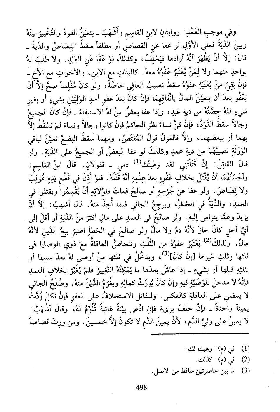 وَفِي مُوَجِبِ الْعَمْدِ: رِوَايَتَانِ لابْنِ الْقَاسِمِ وَأَشْهَبَ - يَتَعَيَّنُ الْقَوَدُ وَالتَّخْيِيرُ بَيْنَهُ وَبَيْنَ الدِّيَةِ فَعَلَى الأَوَّلِ لَوْ عَفَا عَنِ الْقِصَاصِ أَوْ مُطْلَقاً سَقَطَ الْقِصَاصُ وَالدِّيَةُ - قَالَ: إِلا أَنْ يَظْهَرَ أَنَّهُ أَرَادَهَا فَيَحْلِفُ، وَكَذَلِكَ لَوْ عَفَا عَنِ الْعَبَدِ. وَلا طَلَبَ لَهُ بِوَاحِدٍ مِنْهُمَا وَلا لِمَنْ يُعْتَبَرُ عَفْوُهُ مَعَهُ - كَالْبَنَاتِ مَعَ الابْنِ، وَالأَخَوَاتِ مَعَ الأَخِ - فَإِنْ بَقِيَ مَنْ يُعْتَبَرُ عَفْوُهُ سَقَطَ نَصِيبُ الْعَافِي خَاصَّةً، وَلَوْ كَانَ مُفْلِساً صَحَّ إِلا أَنْ يَعْفُوَ بَعْدَ أَنْ يَتَعَيَّنَ الْمَالُ بِاتِّفَاقِهِمَا فَإِنْ كَانَ بَعْدَ عَفْوِ أَحَدِ الْوَلِيَّيْنِ بِشَيْءٍ أَوْ بِغَيْرِ شَيْءٍ فَلَهُ حِصَّتُهُ مِنْ دِيَةِ عَبْدٍ، وَإِذَا عَفَا بَعْضُ مَنْ لَهُ الاسْتِيفَاءُ - فَإِنْ كَانَ الْجَمِيعُ رِجَالاً سَقَطَ الْقَوَدُ، فَإِنْ كُنَّ نِسَاءً نَظَرَ الْحَاكِمُ فَإِنْ كَانُوا رِجَالاً وَنِسَاءً لَمْ يَسْقُطْ إِلا بِهِمَا أَوْ بِبَعْضِهِمَا، وَإِلا فَالْقَوْلُ قَوْلُ الْمُقْتَصِّ، وَمَهْمَا سَقَطَ الْبَضْعُ تَعَيَّنَ لِبَاقِي الْوَرَثَةِ نَصِيبُهُمْ مِنْ دِيَةِ عَمْدٍ وَكَذَلِكَ لَوْ عَفَا الْبَعْضُ أَوِ الْجَمِيعُ عَلَى الدِّيَةِ. وَلَوْ قَالَ الْقَاتِلُ: إِنْ قَتَلْتَنِي فَقَدْ وَهَبْتُكَ (¬1) دَمِي - فَقَوْلانِ. قَالَ ابْنُ الْقَاسِمِ: وَأَحْسَنُهُمَا أَنْ يُقْتَلَ بِخِلافِ عَفْوِهِ بَعْدَ عِلْمِهِ أَنَّهُ قَتَلَهُ.
