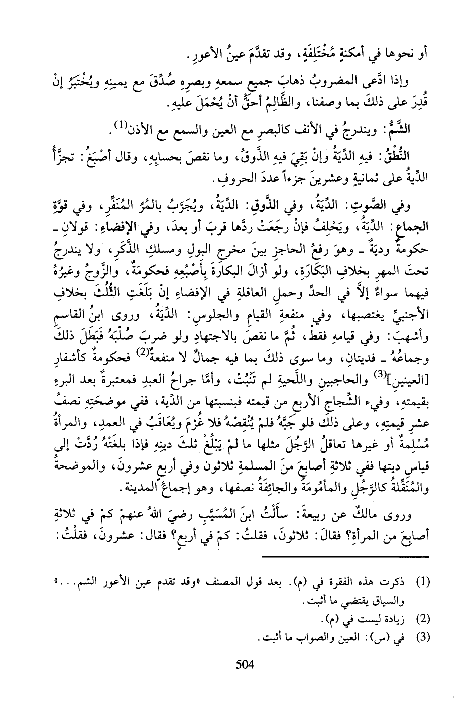 وَرَوَى مَالِكٌ عَنْ رَبِيعَةَ: سَأَلْتُ ابْنَ الْمُسَيَّبِ رَضِيَ اللَّهُ عَنْهُمْ كَمْ فِي ثَلاثَةِ أَصَابِعَ مِنَ الْمَرْأَةِ؟ فَقَالَ: ثَلاثُونَ، فَقُلْتُ: كَمْ فِي أَرْبَعٍ؟ فَقَالَ: عِشْرُونَ، فَقُلْتُ: