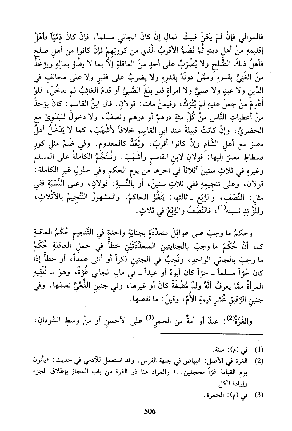 فَالْمَوَالِي فَإِنْ لَمْ يَكُنْ فَبَيْتُ الْمَالِ إِنْ كَانَ الْجَانِي مُسْلِماً، فَإِنْ كَانَ ذِمِّيّاً فَأَهْلُ إِقْلِيمِهِ مِنْ أَهْلِ دِينِهِ ثُمَّ يُضَمُّ الأَقْرَبُ الَّذِي مِنْ كَوْرَتِهِمْ فَإِنْ كَانُوا مِنْ أَهْلِ صُلْحٍ فَأَهْلُ ذَلِكَ الصُّلْحِ وَلا يُضْرَبُ عَلَى أَحَدٍ مِنَ الْعَاقِلَةِ إِلا بِمَا لا يَضُرُّ بِمَالِهِ وَيُؤْخَذُ مِنَ الْغَنِيِّ بِقَدْرِهِ وَمِمَّنْ دُونَهُ بِقَدْرِهِ وَلا يُضْرَبُ عَلَى فَقِيرٍ وَلا عَلَى مُخَالِفٍ فِي الدِّينِ وَلا عَبْدٍ وَلا صَبِيٍّ وَلا امْرَأَةٍ فَلَوْ بَلَغَ الصَّبِيُّ أَوْ قَدِمَ الْغَائِبُ لَمْ يَدْخُلْ، فَلَوْ أُعْدِمَ مَنْ جُعِلَ عَلَيْهِ لَمْ يُتْرَكْ، وَفِيمَنْ مَاتَ: قَوْلانِ. قَالَ ابْنُ الْقَاسِمِ: كَانَ يُؤْخَذُ مِنْ أَعْطِيَاتِ النَّاسِ مِنْ كُلِّ مِئَةٍ دِرْهَمٌ أَوْ دِرْهَمٌ وَنَصِفٌ، وَلا دُخَولَ لِلْبَدَوِيِّ مَعَ الْحَضَرِيِّ، وَإِنْ كَانَتْ قَبِيلَةً عِنْدَ ابْنِ الْقَاسِمِ خِلافاً لأَشْهَبَ، كَمَا لا يَدْخُلُ أَهْلُ مِصْرَ مَعَ أَهْلِ الشَّامِ وَإِنْ كَانُوا أَقْرَبَ، وَيُعَدُّ كَالْمَعْدُومِ. وَفِي ضَمِّ مِثْلِ كَوْرِ فُسَطَاطِ مِصْرَ إِلَيْهِا: قَوْلانِ لابْنِ الْقَاسِمِ وَأَشْهَبَ.
