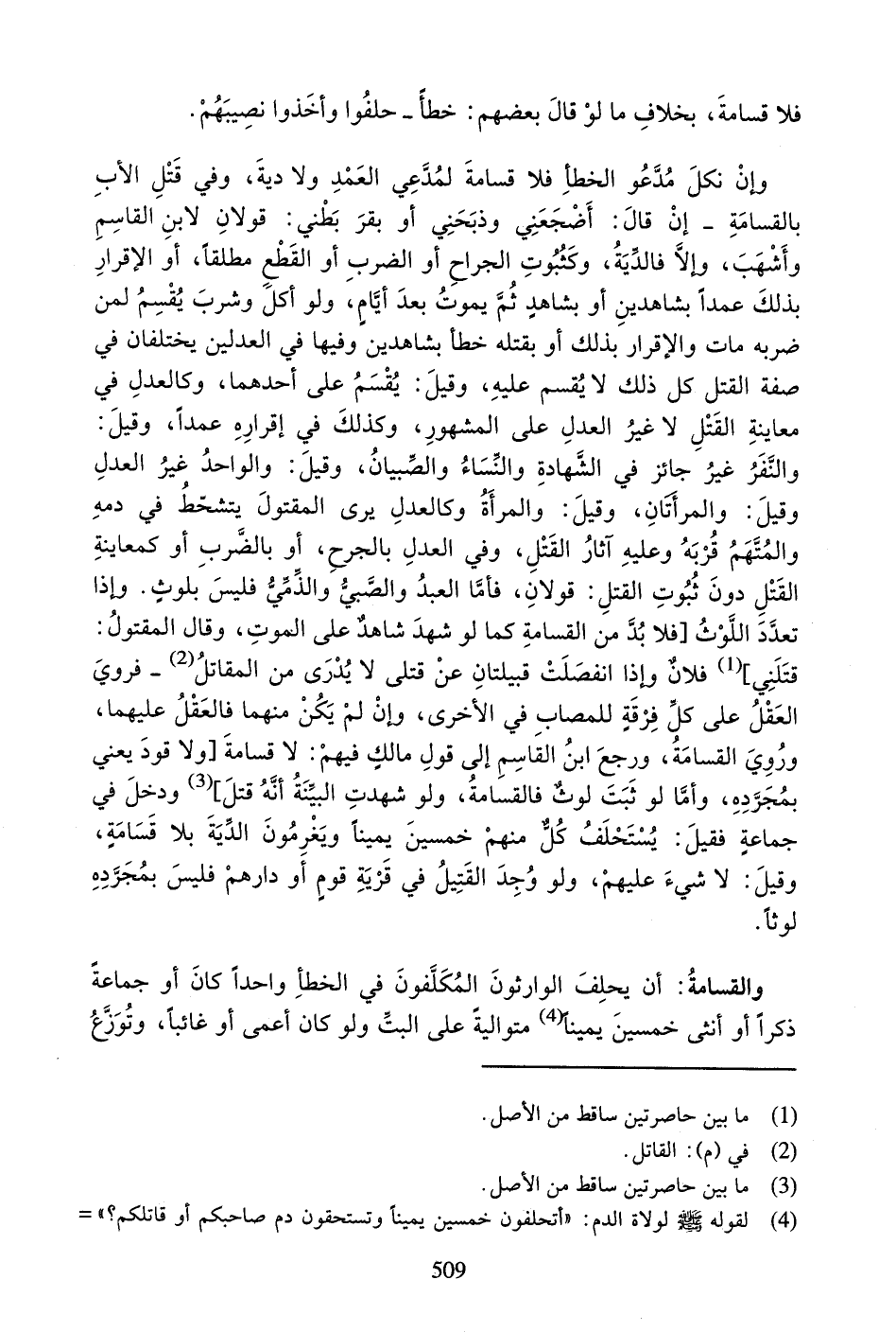 وَالْقَسَامَةُ: أَنْ يَحْلِفُ الْوَارِثُونَ الْمُكَلَّفُونَ فِي الْخَطَأِ وَاحِداً كَانَ أَوْ جَمَاعَةً ذَكَراً أَوْ أُنْثَى خَمْسِينَ يَمِيناً مُتَوَالِيَةً عَلَى الْبَتِّ وَلَوْ كَانَ أَعْمَى أَوْ غَائِباً، وَتُوَزَّعُ