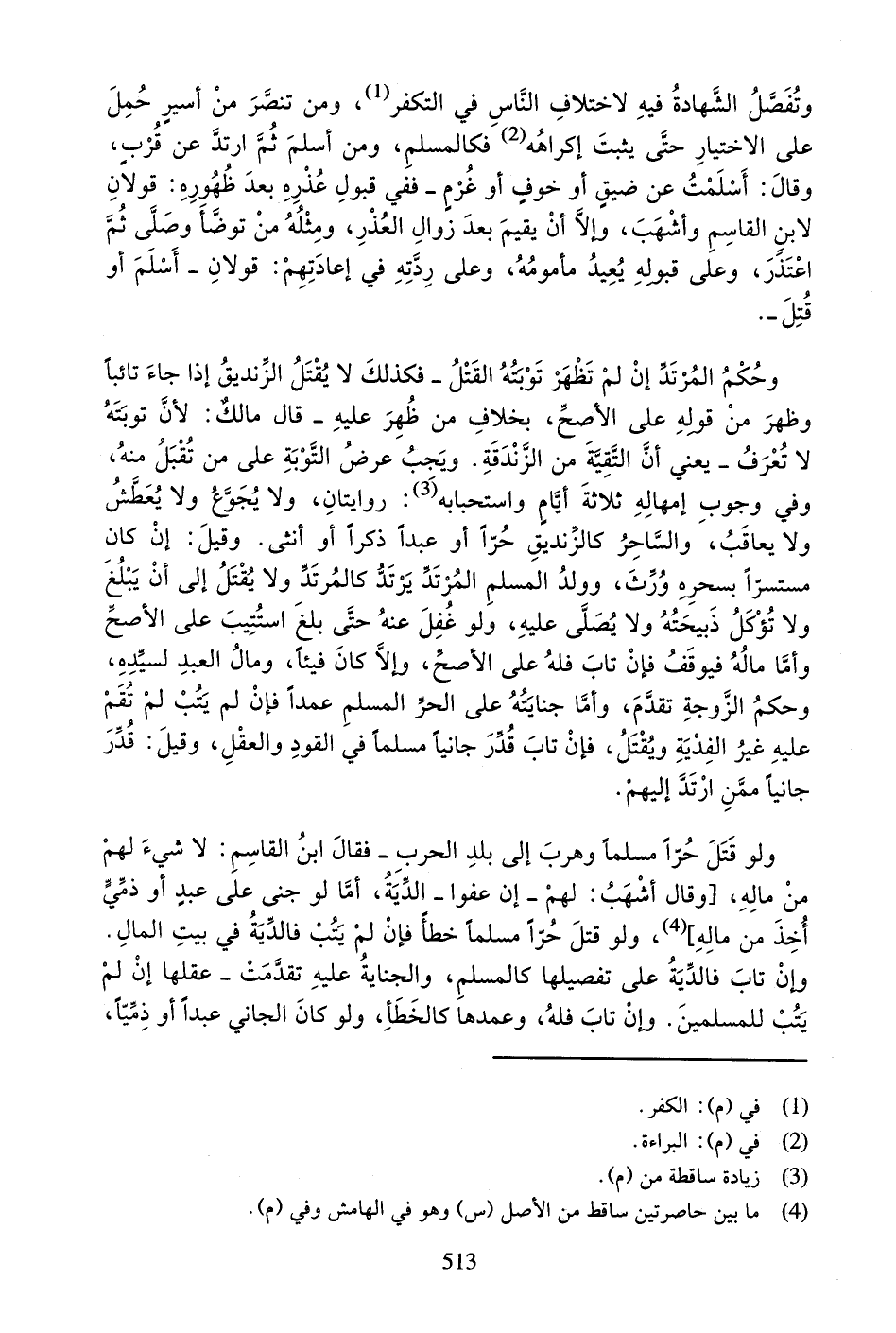 وَحُكْمُ الْمُرْتَدِّ إِنْ لَمْ تَظْهَرْ تَوْبَتُهُ الْقَتْلُ - فَكَذَلِكَ لا يُقْتَلُ الزِّنْدِيقُ إِذَا جَاءَ تَائِباً وَظَهَرَ مِنْ قَوْلِهِ عَلَى الأَصَحِّ، بِخِلافِ مَنْ ظُهِرَ عَلَيْهِ - قَالَ مَالِكٌ: لأَنَّ تَوْبَتَهُ لا تُعْرَفُ - يَعْنِي أَنَّ التَّقِيَّةَ مِنَ الزَّنْدَقَةِ. وَيَجِبُ عَرْضُ التَّوْبَةِ عَلَى مَنْ تُقْبَلُ مِنْهُ، وَفِي وُجُوبِ إِمْهَالِهِ ثَلاثَةَ أَيَّامٍ وَاسْتِحْبَابِهِ: رِوَايَتَانِ، وَلا يُجَوَّعُ وَلا يُعَطَّشُ وَلا يُعَاقَبُ، وَالسَّاحِرُ كَالزِّنْدِيقِ حُرّاً أَوْ عَبْداً ذَكَراً أَوْ أُنْثَى. وَقِيلَ: إِنْ كَانَ مُسْتَسَرّاً بِسِحْرِهِ وُرِّثَ، وَوَلَدُ الْمُسْلِمِ الْمُرْتَدِّ يَرْتَدُّ كَالْمُرْتَدِّ وَلا يُقْتَلُ إِلَى أَنْ يَبْلُغَ وَلا تُؤْكَلُ ذَبِيحَتُهُ وَلا يُصَلَّى عَلَيْهِ، وَلَوْ غُفِلَ عَنْهُ حَتَّى بَلَغَ اسْتُتِيبَ عَلَى الأَصَحِّ وَأَمَّا مَالُهُ فَيُوقَفُ فَإِنْ تَابَ فَلَهُ عَلَى الأَصَحِّ، وَإِلا كَانَ فَيْئاً، وَمَالُ الْعَبْدِ لِسَيِّدِهِ، وَحُكْمُ الزَّوْجَةِ تَقَدَّمَ، وَأَمَّا جِنَايَتُهُ عَلَى الْحُرِّ الْمُسْلِمِ عَمْداً فَإِنْ لَمْ يَتُبْ لَمْ تُقَمْ عَلَيْهِ غَيْرُ الْفِدْيَةِ وَيُقْتَلُ، فَإِنْ تَابَ قُدِّرَ جَانِياً مُسْلِماً فِي الْقَوَدِ وَالْعَقْلِ، وَقِيلَ: قُدِّرَ جَانِياً مِمَّنِ ارْتَدَّ إِلَيْهِمْ.