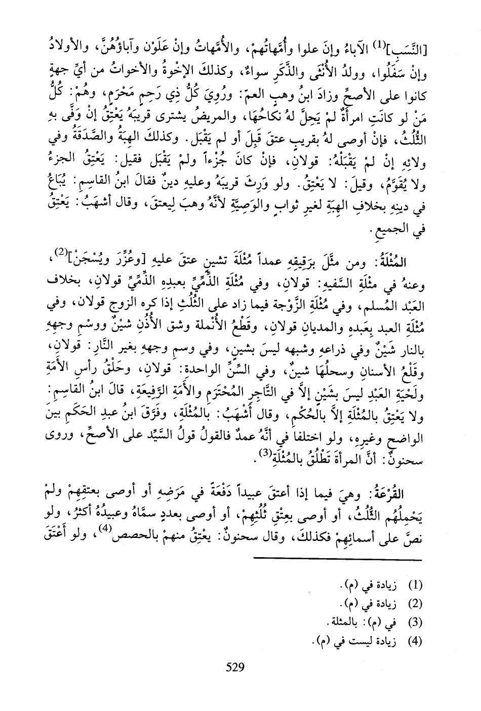[النَّسَبِ] الآبَاءُ وَإِنْ عَلَوْا وَأُمَّهَاتُهُمْ، وَالأُمَّهَاتُ وَإِنْ عَلَوْنَ وَآبَاؤُهُنَّ، وَالأَوْلادُ وَإِنْ سَفَلُوا، وَوَلَدُ الأُنْثَى وَالذَّكَرِ سَوَاءٌ، وَكَذَلِكَ الإِخْوَةُ وَالأَخَوَاتُ مِنْ أَيِّ جِهَةٍ كَانُوا عَلَى الأَصَحِّ وَزَادَ ابْنُ وَهْبٍ الْعَمَّ: وَرُوِيَ كُلُّ ذِي رَحِمٍ مَحْرَمٍ، وَهُمْ: كُلُّ مَنْ لَوْ كَانَتِ امْرَأَةً لَمْ يَحِلَّ لَهُ نِكَاحُهَا، وَالْمَرِيضُ يَشْتَرِي قَرِيبَهُ يَعْتِقُ إِنْ وَفَّى بِهِ الثُّلُثُ، فَإِنْ أَوْصَى لَهُ بِقَرِيبٍ عَتَقَ قَبِلَ أَوْ لَمْ يَقْبَلْ. وَكَذَلِكَ الْهِبَةُ وَالصَّدَقَةُ وَفِي وَلائِهِ إِنْ لَمْ يَقْبَلْهُ: قَوْلانِ، فَإِنْ كَانَ جُزْءاً وَلَمْ يَقْبَلْ فَقِيلَ: يَعْتِقُ الْجُزْءَ وَلا يُقَوَّمُ، وَقِيلَ: لا يَعْتِقُ. وَلَوْ وَرِثَ قَرِيبَهُ وَعَلَيْهِ دَيْنٌ فَقَالَ ابْنُ الْقَاسِمِ: يُبَاعُ فِي دَيْنِهِ بِخِلافِ الْهِبَةِ لِغَيْرِ ثَوَابٍ وَالْوَصِيَّةِ لأَنَّهُ وَهَبَ لِيَعْتِقَ، وَقَالَ أَشْهَبُ: يَعْتِقُ فِي الْجَمِيعِ.