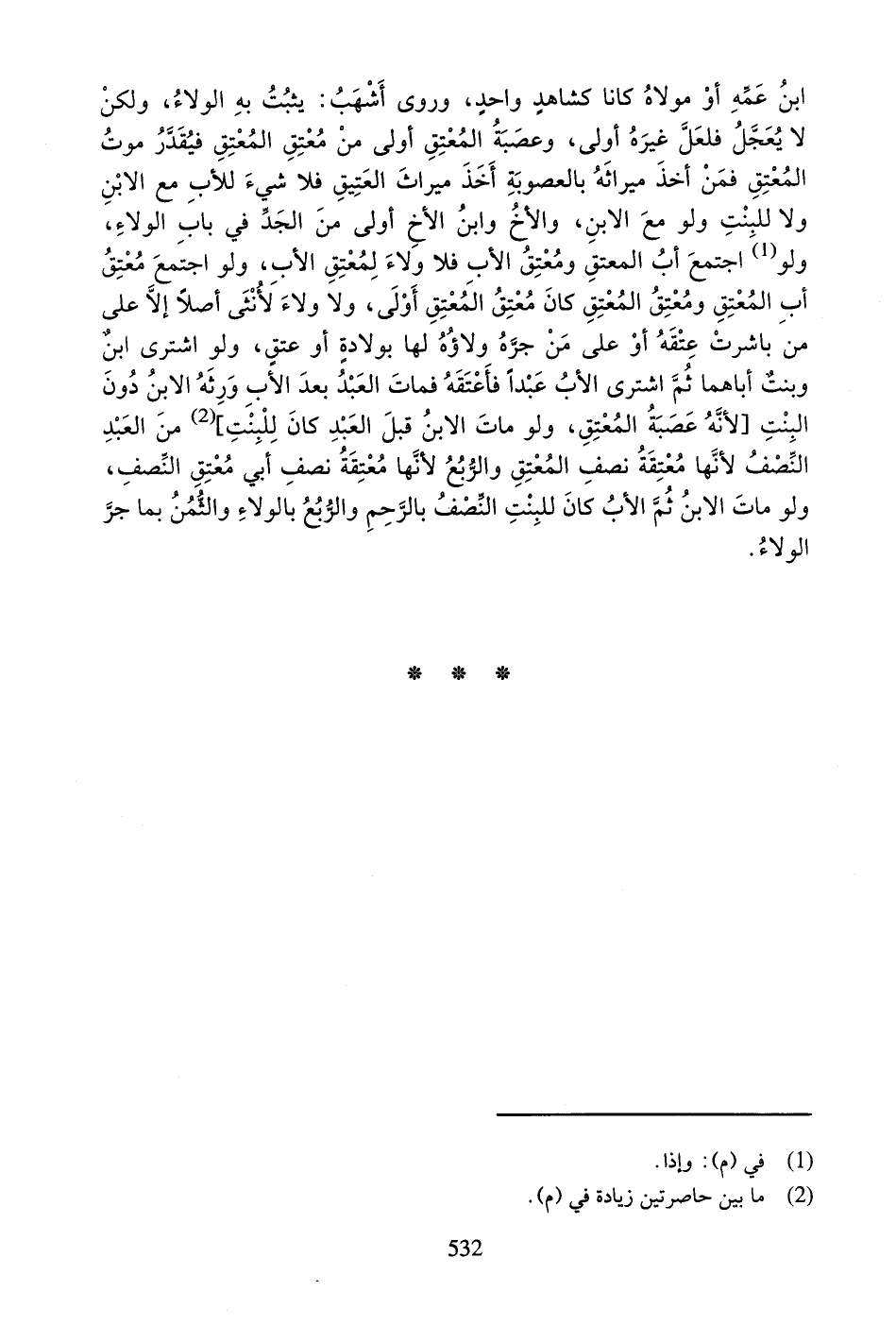 ابْنُ عَمِّهِ أَوْ مَوْلاهُ كَانَا كَشَاهِدٍ وَاحِدٍ، وَرَوَى أَشْهَبُ: يَثْبُتُ بِهِ الْوَلاءُ، وَلَكِنْ لا يُعْجَلُ فَلَعَلَّ غَيْرَهُ أَوْلَى، وَعَصَبَةُ الْمُعْتِقِ أَوْلَى مِنْ مُعْتِقِ الْمُعْتِقِ فَيُقَدَّرُ مَوْتُ الْمُعْتِقِ فَمَنْ أَخَذَ مِيرَاثَهُ بِالْعُصُوبَةِ أَخَذَ مِيرَاثَ الْعِتْيقِ فَلا شَيْءَ لِلأَبِ مَعَ الابْنِ وَلا لِلْبِنْتِ وَلَوْ مَعَ الابْنِ، وَالأَخُ وَابْنُ الأَخِ أَوْلَى مِنَ الْجَدِّ فِي بَابِ الْوَلاءِ، وَلَوِ (¬1)