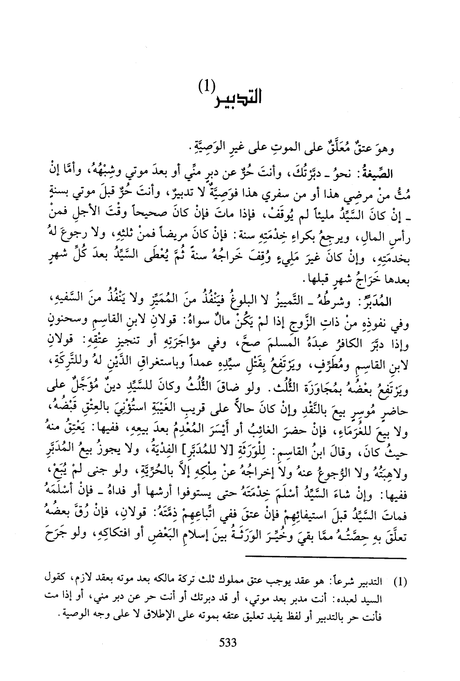 الصِّيغَةُ: نَحْوُ - دَبَّرْتُكَ، وَأَنْتَ حُرٌّ عَنْ دُبُرٍ مِنِّي أَوْ بَعْدَ مَوْتِي وَشِبْهُهُ، وَأَمَّا إِنْ مِتُّ مِنْ مَرَضِي هَذَا أَوْ مِنْ سَفَرِي هَذَا فَوَصِيَّةٌ لا تَدْبِيرٌ، وَأَنْتَ حُرٌّ قَبْلَ مَوْتِي بِسَنَةٍ - إِنْ كَانَ السَّيِّدُ مَلِيئاً لَمْ يُوقَفْ، فَإِذَا مَاتَ فَإِنْ كَانَ صَحِيحاً وَقْتَ الأَجَلِ فَمِنْ رَأْسِ الْمَالِ، وَيَرْجِعُ بِكِرَاءِ خِدْمَتِهِ سَنَةً: فَإِنْ كَانَ مَرِيضاً فَمِنْ ثُلُثِهِ، وَلا رُجُوعَ لَهُ بِخِدْمَتِهِ، وَإِنْ كَانَ غَيْرَ مَلِيءٍ وُقِفَ خَرَاجُهُ سَنَةً ثُمَّ يُعْطَى السَّيِّدُ بَعْدَ كُلِّ شَهْرٍ بَعْدَهَا خَرَاجُ شَهْرٍ قَبْلَهَا.