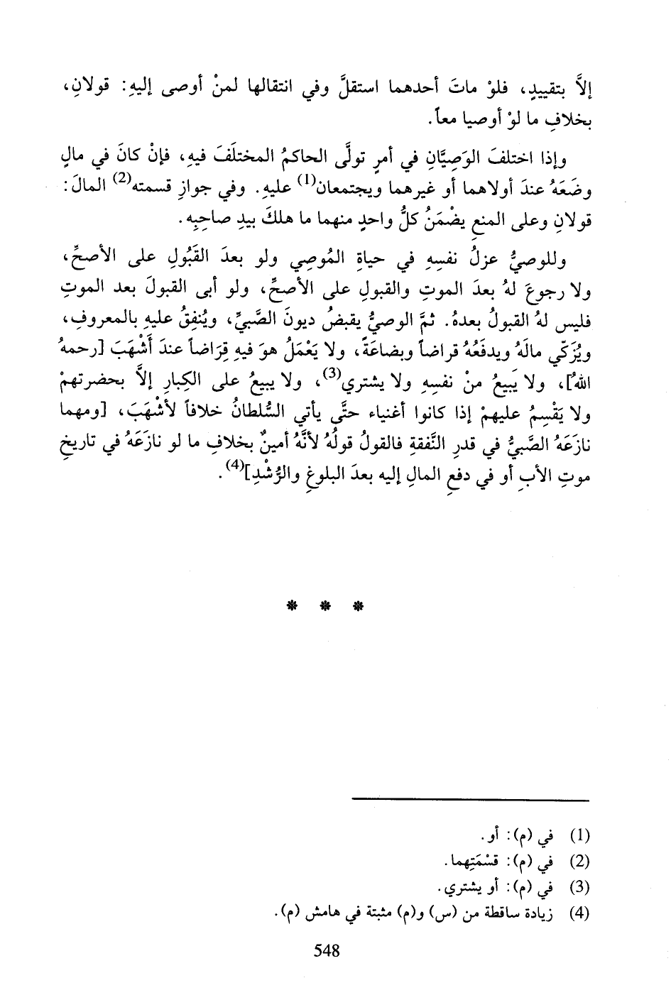 وَلِلْوَصِيِّ عَزْلُ نَفْسِهِ فِي حَيَاةِ الْمُوصِي وَلَوْ بَعْدَ الْقَبُولِ عَلَى الأَصَحِّ، وَلا رُجُوعَ لَهُ بَعْدَ الْمَوْتِ وَالْقَبُولِ عَلَى الأَصَحِّ، وَلَوْ أَبَى الْقَبُولَ بَعْدَ الْمَوْتِ فَلَيْسَ لَهُ الْقَبُولُ بَعْدَهُ. ثُمَّ الْوَصِيُّ يَقْبِضُ دُيُونَ الصَّبِيِّ، وَيُنْفِقُ عَلَيْهِ بِالْمَعْرُوفِ، وَيُزَكِّي مَالَهُ وَيَدْفَعُهُ قِرَاضاً وَبِضَاعَةً، وَلا يَعْمَلُ هُوَ فِيهِ قِرَاضاً عِنْدَ أَشْهَبَ [رَحِمَهُ اللَّهُ]، وَلا يَبِيعُ مِنْ نَفْسِهِ وَلا يَشْتَرِي (¬3)، وَلا يَبِيعُ عَلَى الْكِبَارِ إِلا بِحَضْرَتِهِمْ وَلا يَقْسِمُ عَلَيْهِمْ إِذَا كَانُوا أَغْنِيَاءَ حَتَّى يَأْتِيَ السُّلْطَانُ خِلافاً لأَشْهَبَ، [وَمَهْمَا نَازَعَهُ الصَّبِيُّ فِي قَدْرِ النَّفَقَةِ فَالْقَوْلُ قَوْلُهُ لأَنَّهُ أَمِينٌ بِخِلافِ مَا لَوْ نَازَعَهُ فِي تَارِيخِ مَوْتِ الأَبِ أَوْ فِي دَفْعِ الْمَالِ إِلَيْهِ بَعْدَ الْبُلُوغِ وَالرُّشْدِ].