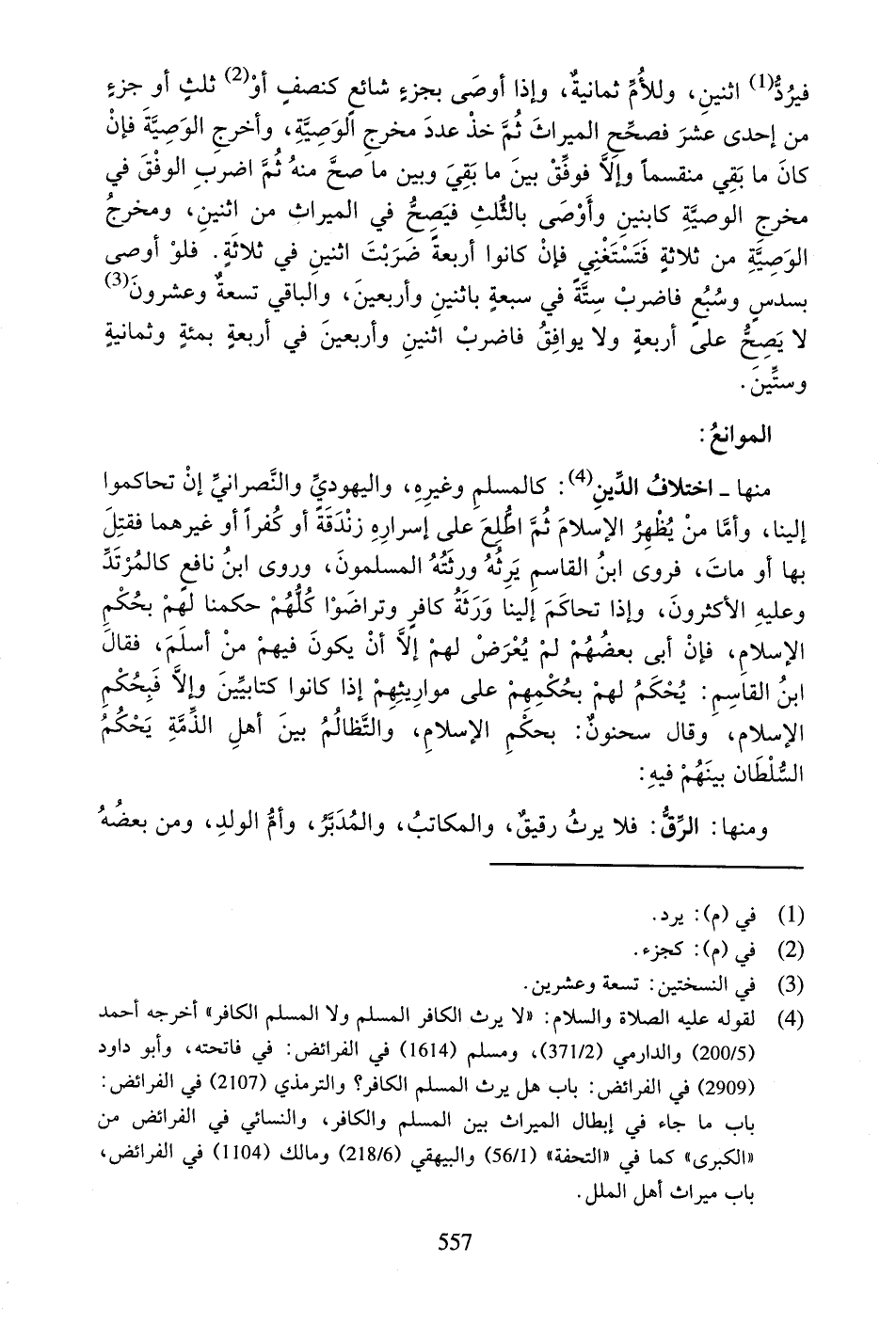 وَمِنْهَا: الرِّقُّ: فَلا يَرِثُ رَقِيقٌ، وَالْمُكَاتَبُ، وَالْمُدَبَّرُ، وَأُمُّ الْوَلَدِ، وَمَنْ بَعْضُهُ