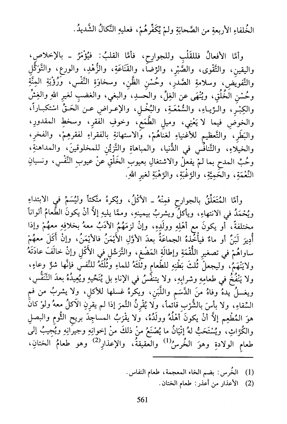 وَأَمَّا الْمُتَعَلِّقُ بِالْجَوَارِحِ فَمِنْهُ - الأَكْلُ، وَيُكْرَهُ مُتَّكِئاً وَلْيُسَمِّ فِي الابْتِدَاءِ وَيَحْمَدُ فِي الانْتِهَاءِ، وَيَأْكُلُ وَيَشْرَبُ بِيَمِينِهِ، وَمِمَّا يَلِيهِ إِلا أَنْ يَكُونَ الطَّعَامُ أَلْوَاناً مُخْتَلِفَةً، أَوْ يَكُونَ مَعَ أَهْلِهِ وَوَلَدِهِ، وَإِنْ لَزِمَهُمُ الأَدَبُ مَعَهُ بِخِلافِهِ مَعَهُمْ وَإِذَا أُدِيرَ لَبَنٌ أَوْ مَاءٌ فَيَأْخُذُهُ الْجَمَاعَةُ بَعْدَ الأَوَّلِ الأَيْمَنُ فَالأَيْمَنُ، وَإِنْ أَكَلَ مَعَهُمْ سَاوَاهُمْ فِي تَصْغِيرِ اللُّقْمَةِ وَإِطَالَةِ الْمَضْغِ، وَالتَّرَسُّلِ فِي الأَكْلِ وَإِنْ خَالَفَ عَادَتَهُ وَلا يَنْهَمُ، وَلْيَجْعَلْ ثُلُثَ بَطْنِهِ لِلطَّعَامِ وَثُلُثَهُ لِلْمَاءِ وَثُلُثَهُ لِلنَّفَسِ فَإِنَّهَا شَرُّ وِعَاءٍ، وَلا يَنْفُخُ فِي طَعَامِهِ وَشَرَابِهِ، وَلا يَتَنَفَّسُ فِي الإِنَاءِ بَلْ يُنَحِّيهِ وَيُعِيدُهُ بَعْدَ التَّنَفُّسِ، وَيَغْسِلُ يَدَهُ وَفَاهُ مِنَ الدَّسَمِ وَاللَّبَنِ، وَيُكْرَهُ غَسْلُهَا لِلأَكْلِ، وَلا يَشْرَبْ مِنْ فَمِ السِّقَاءِ، وَلا بَأْسَ بِالشُّرْبِ قَائِماً، وَلا يَقْرِنُ التَّمْرَ إِذَا لَمْ يَقْرِنِ الآكِلُ مَعَهُ وَلَوْ كَانَ هُوَ الْمُطْعِمَ إِلا أَنْ يَكُونَ أَهْلَهُ وَوَلَدَهُ، وَلا يَقْرَبُ الْمَسَاجِدَ بِرِيحِ الثُّومِ وَالْبَصَلِ وَالْكُرَّاثِ، وَيُسْتَحَبُّ لَهُ إِتْيَانُ مَا يَصْنَعُ مِنْ ذَلِكَ مِنْ إِخْوَانِهِ وَجِيرَانِهِ وَيُجِيبُ إِلَى طَعَامِ الْوِلادَةِ وَهُوَ الْخُرْسُ وَالْعَقِيقَةُ، وَالإِعْذَارِ وَهُوَ طَعَامُ الْخِتَانِ،