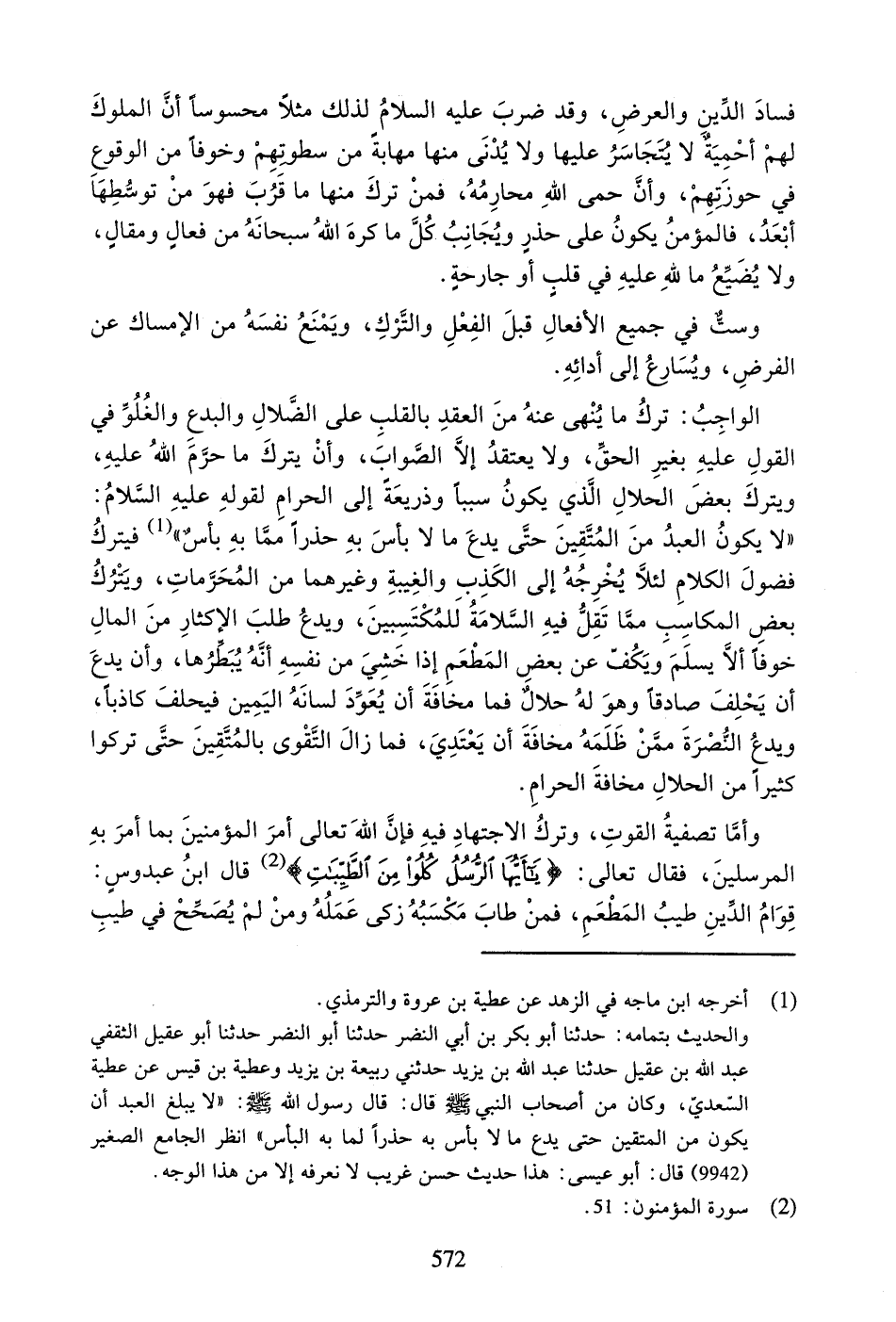 فَسَادَ الدِّينِ وَالْعِرْضِ، وَقَدْ ضَرَبَ عَلَيْهِ السَّلامُ لِذَلِكَ مَثَلاً مَحْسُوساً أَنَّ الْمُلُوكَ لَهُمْ أَحْمِيَةٌ لا يُتَجَاسَرُ عَلَيْهَا وَلا يُدْنَى مِنْهَا مَهَابَةً مِنْ سَطْوَتِهِمْ، وَخَوْفاً مِنَ الْوُقُوعِ فِي حَوْزَتِهِمْ، وَأَنَّ حِمَى اللَّهِ مَحَارِمَهُ، فَمَنْ تَرَكَ مِنْهَا مَا قَرُبَ فَهُوَ مِنْ تَوَسُّطِهَا أَبْعَدُ، فَالْمُؤْمِنُ يَكُونُ عَلَى حَذَرٍ وَيُجَانِبُ كُلَّ مَا كَرِهَ اللَّهُ سُبْحَانَهُ مِنْ فِعَالٍ وَمَقَالٍ، وَلا يَضِيعُ مَا لِلَّهِ عَلَيْهِ فِي قَلْبٍ أَوْ جَارِحَةٍ.