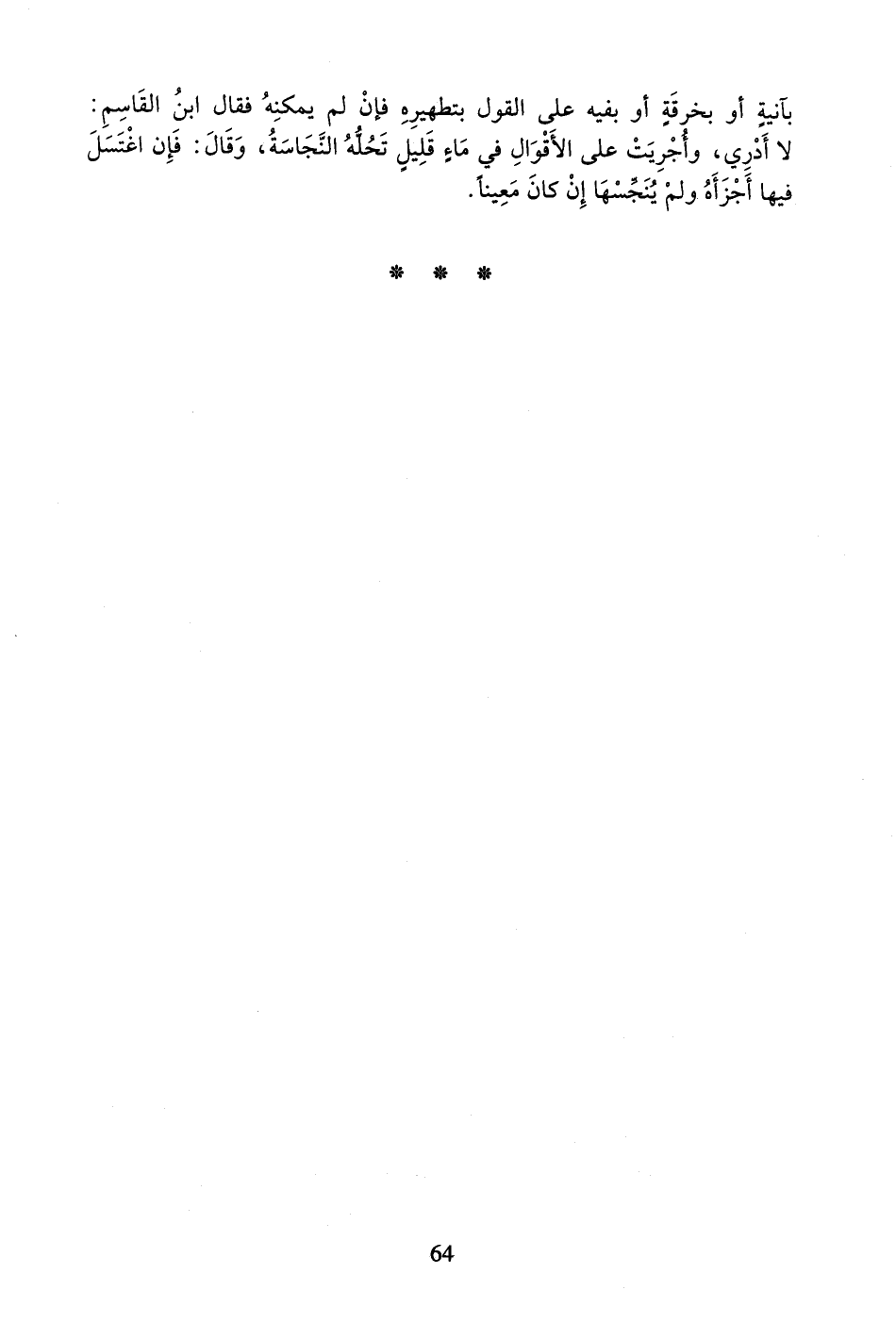 : بِآنِيَةٍ أَوْ بِخِرْقَةٍ أَوْ بِفِيهِ عَلَى الْقَوْلِ بِتَطْهِيرِهِ فَإِنْ لَمْ يُمْكِنْهُ فَقَالَ ابْنُ الْقَاسِمِ: لا أَدْرِي، وَأُجْرِيَتْ عَلَى الأَقْوَالِ فِي مَاءٍ قَلِيلٍ تَحُلُّهُ النَّجَاسَةُ، وَقَالَ: فَإِنِ اغْتَسَلَ فِيهَا أَجْزَأَهُ وَلَمْ يُنَجِّسْهَا إِنْ كَانَ مَعِيناً.