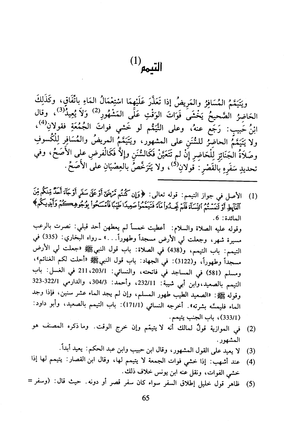 وَيَتَيَمَّمُ الْمُسَافِرُ وَالْمَرِيضُ إِذَا تَعَذَّرَ عَلَيْهِمَا اسْتِعْمَالُ الْمَاءِ بِاتِّفَاقٍ، وَكَذَلِكَ الْحَاضِرُ الصَّحِيحُ يَخْشَى فَوَاتَ الْوَقْتِ عَلَى الْمَشْهُورِ وَلا يُعِيدُ، وَقَالَ ابْنُ حَبِيبٍ: رَجَعَ عَنْهُ، وَعَلَى التَّيَمُّمِ لَوْ خَشِيَ فَوَاتَ الْجُمُعَةِ فَقَوْلانِ، وَلا يَتَيَمَّمُ الْحَاضِرُ لِلسُّنَنِ عَلَى الْمَشْهُورِ، وَيَتَيَمَّمُ الْمَرِيضُ وَالْمُسَافِرُ لِلْكُسُوفِ وَصَلاةِ الْجَنَائِزِ لِلْحَاضِرِ إِنْ لَمْ تَتَعَيَّنْ فَكَالسُّنَنِ وَإِلا فَكَالْفَرْضِ عَلَى الأَصَحِّ، وَفِي تَحْدِيدِ سَفَرِهِ بِالْقَصْرِ: قَوْلانِ، وَلا يَتَرَخَّصُ بِالْعِصْيَانِ عَلَى الأَصَحِّ.