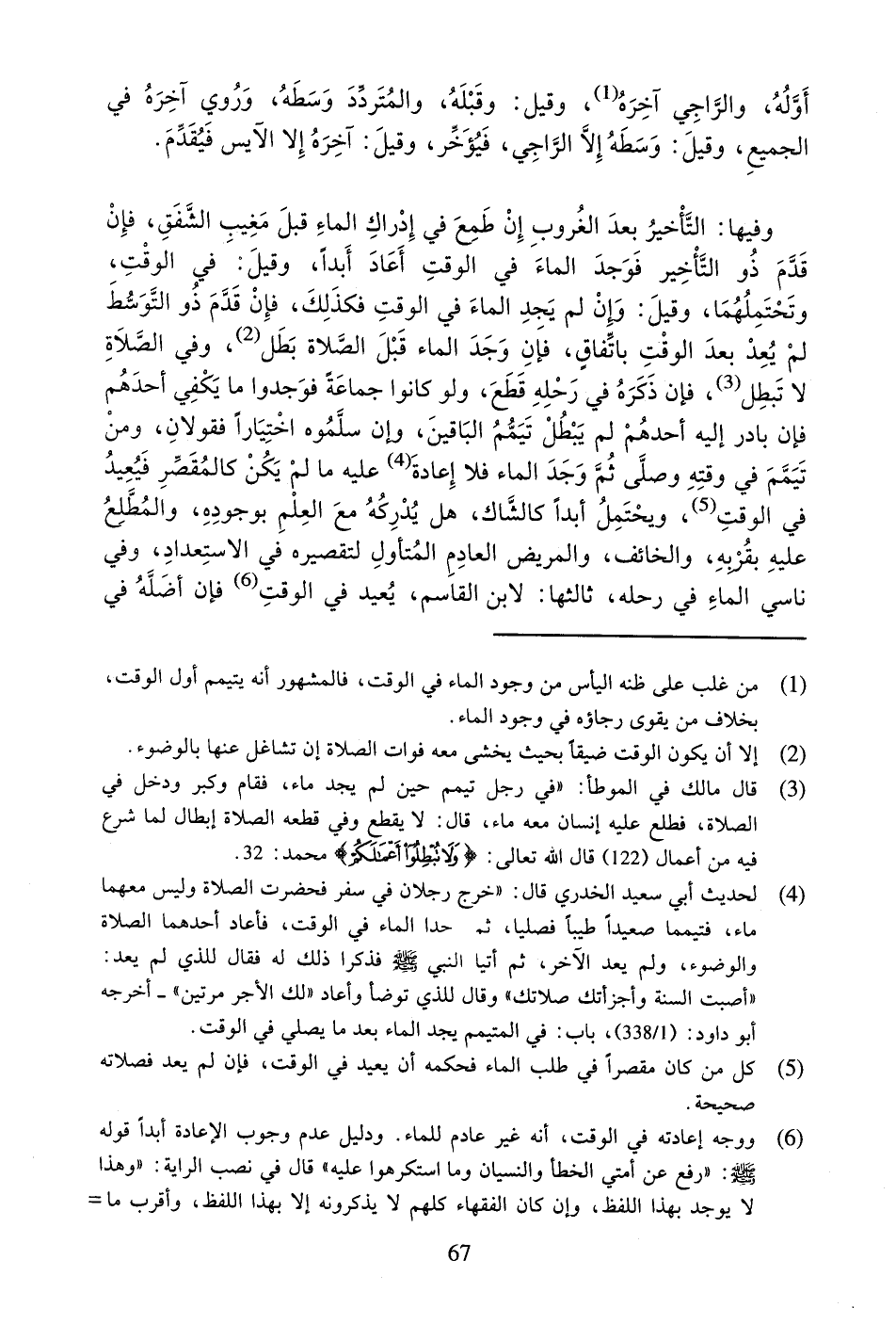 وَفِيهَا: التَّأْخِيرُ بَعْدَ الْغُرُوبِ إِنْ طَمِعَ فِي إِدْرَاكِ الْمَاءِ قَبْلَ مَغِيبِ الشَّفَقِ، فَإِنْ قُدِّمَ ذُو التَّأْخِيرِ فَوَجَدَ الْمَاءَ فِي الْوَقْتِ أَعَادَ أَبَداً، وَقِيلَ: فِي الْوَقْتِ، وَتَحْتَمِلُهُمَا، وَقِيلَ: وَإِنْ لَمْ يَجِدِ الْمَاءَ فِي الْوَقْتِ فَكَذَلِكَ، فَإِنْ قُدِّمَ ذُو التَّوَسُّطِ لَمْ يُعِدْ بَعْدَ الْوَقْتِ بِاتِّفَاقٍ، فَإِنْ وَجَدَ الْمَاءَ قَبْلَ الصَّلاةِ بَطَلَ، وَفِي الصَّلاةِ لا تَبْطُلُ، فَإِنْ ذَكَرَهُ فِي رَحْلِهِ قَطَعَ، وَلَوْ كَانُوا جَمَاعَةً فَوَجَدُوا مَا يَكْفِي أَحَدَهُمْ فَإِنْ بَادَرَ إِلَيْهِ أَحَدُهُمْ لَمْ يَبْطُلْ تَيَمُّمُ الْبَاقِينَ، وَإِنْ سَلَّمُوهُ اخْتِيَاراً فَقَوْلانِ، وَمَنْ تَيَمَّمَ فِي وَقْتِهِ وَصَلَّى ثُمَّ وَجَدَ الْمَاءَ فَلا إِعَادَةَ عَلَيْهِ مَا لَمْ يَكُنْ كَالْمُقَصِّرِ فَيُعِيدُ فِي الْوَقْتِ، وَيَحْتَمِلُ أَبَداً كَالشَّاكِّ، هَلْ يُدْرِكُهُ مَعَ الْعِلْمِ بِوُجُودِهِ، وَالْمُطَّلِعُ عَلَيْهِ بِقُرْبِهِ، وَالْخَائِفُ، وَالْمَرِيضُ الْعَادِمُ الْمُتَأَوِّلُ لِتَقْصِيرِهِ فِي الاسْتِعْدَادِ، وَفِي نَاسِي الْمَاءِ فِي رَحْلِهِ، ثَالِثُهَا: لابْنِ الْقَاسِمِ، يُعِيدُ فِي الْوَقْتِ فَإِنْ أَضَلَّهُ فِي رَحْلِهِ فَأَوْلَى أَلا يُعِيدَ، فَإِنْ أَضَلَّ
