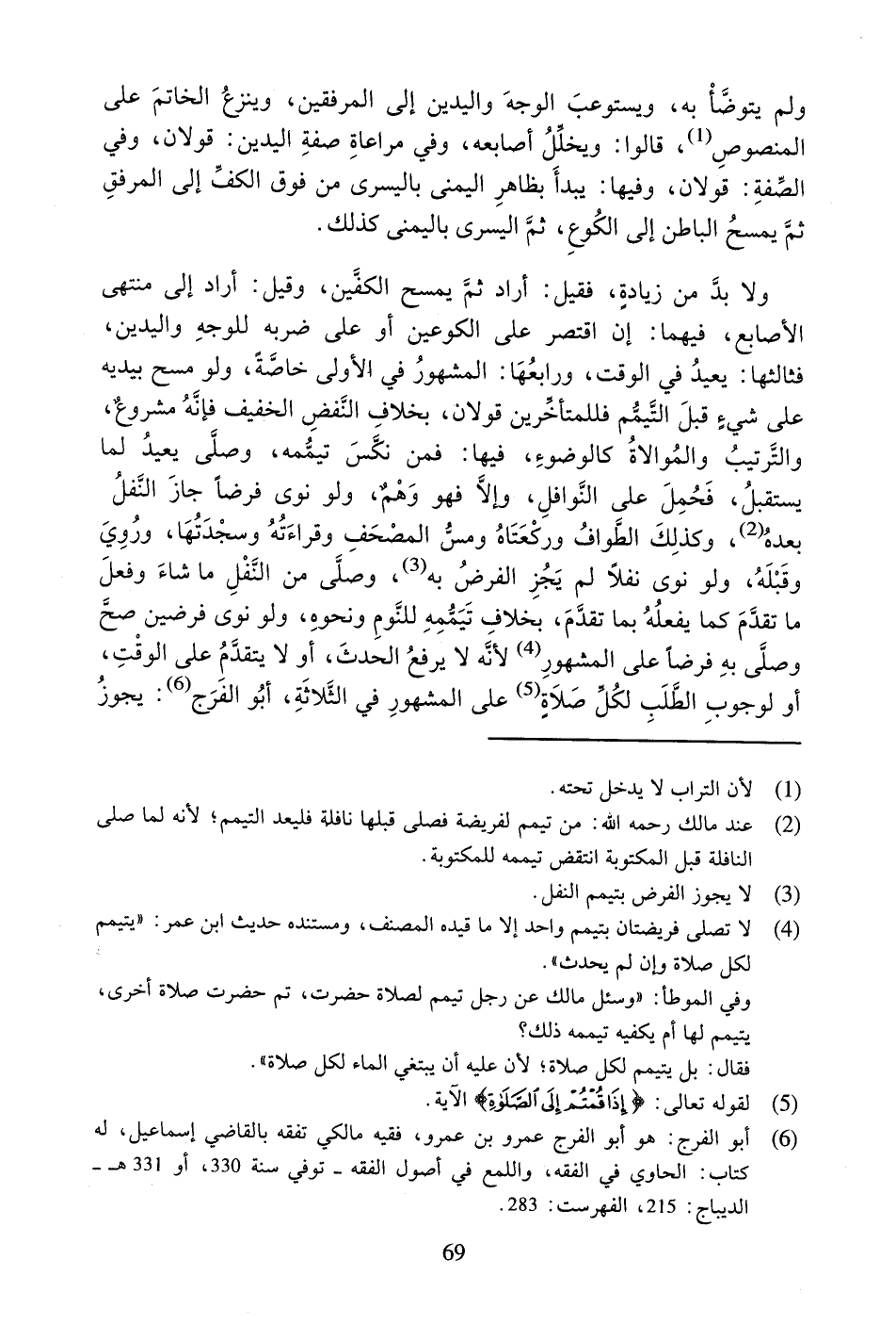 وَلا بُدَّ مِنْ زِيَادَةٍ، فَقِيلَ: أَرَادَ ثُمَّ يَمْسَحُ الْكَفَّيْنِ، وَقِيلَ: أَرَادَ إِلَى مُنْتَهَى الأَصَابِعِ، فِيهِمَا: إِنِ اقْتَصَرَ عَلَى الْكُوعَيْنِ أَوْ عَلَى ضَرْبِهِ لِلْوَجْهِ وَالْيَدَيْنِ، فَثَالِثُهَا: يُعِيدُ فِي الْوَقْتِ، وَرَابِعُهَا: الْمَشْهُورُ فِي الأُولَى خَاصَّةً، وَلَوْ مَسَحَ بِيَدَيْهِ عَلَى شَيْءٍ قَبْلَ التَّيَمُّمِ فَلِلْمُتَأَخِّرِينَ قَوْلانِ، بِخِلافِ النَّفْضِ الْخَفِيفِ فَإِنَّهُ مَشْرُوعٌ، وَالتَّرْتِيبُ وَالْمُوَالاةُ كَالْوُضُوءِ، فِيهَا: فَمَنْ نَكَّسَ تَيَمُّمَهُ، وَصَلَّى يُعِيدُ لِمَا يُسْتَقْبَلُ، فَحُمِلَ عَلَى النَّوَافِلِ، وَإِلا فَهُوَ وَهْمٌ، وَلَوْ نَوَى فَرْضاً جَازَ النَّفْلُ بَعْدَهُ، وَكَذَلِكَ الطَّوَافُ وَرَكَعْتَاهُ وَمَسُّ الْمُصْحَفِ وَقِرَاءَتُهُ وَسَجْدَتُهَا، وَرُوِيَ وَقَبْلَهُ، وَلَوْ نَوَى نَفْلاً لَمْ يُجْزِ الْفَرْضُ بِهِ، وَصَلَّى مِنَ النَّفْلِ مَا شَاءَ وَفَعَلَ مَا تَقَدَّمَ كَمَا يَفْعَلُهُ بِمَا تَقَدَّمَ، بِخِلافِ تَيَمُّمِهِ لِلنَّوْمِ وَنَحْوِهِ، وَلَوْ نَوَى فَرْضَيْنِ صَحَّ وَصَلَّى بِهِ فَرْضاً عَلَى الْمَشْهُورِ لأَنَّهُ لا يَرْفَعُ الْحَدَثَ، أَوْ لا يَتَقَدَّمُ عَلَى الْوَقْتِ، أَوْ لِوُجُوبِ الطَّلَبِ لِكُلِّ صَلاةٍ عَلَى الْمَشْهُورِ فِي الثَّلاثَةِ، أَبُو الْفَرَجِ: يَجُوزُ
