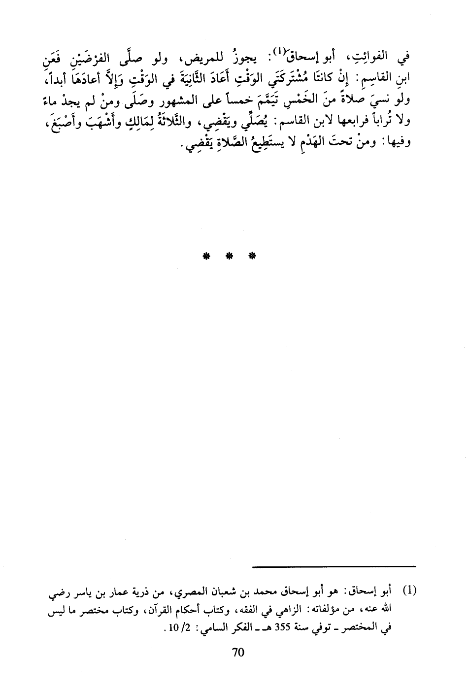 فِي الْفَوَائِتِ، أَبُو إِسْحَاقَ: يَجُوزُ لِلْمَرِيضِ، وَلَوْ صَلَّى الْفَرْضَيْنِ فَعَنِ ابْنِ الْقَاسِمِ: إِنْ كَانَتَا مُشْتَرِكَتَيِ الْوَقْتِ أَعَادَ الثَّانِيَةَ فِي الْوَقْتِ وَإِلا أَعَادَهَا أَبَداً، وَلَوْ نَسِيَ صَلاةً مِنَ الْخَمْسِ تَيَمَّمَ خَمْساً عَلَى الْمَشْهُورِ وَصَلَّى وَمَنْ لَمْ يَجِدْ مَاءً وَلا تُرَاباً فَرَابِعُهَا
