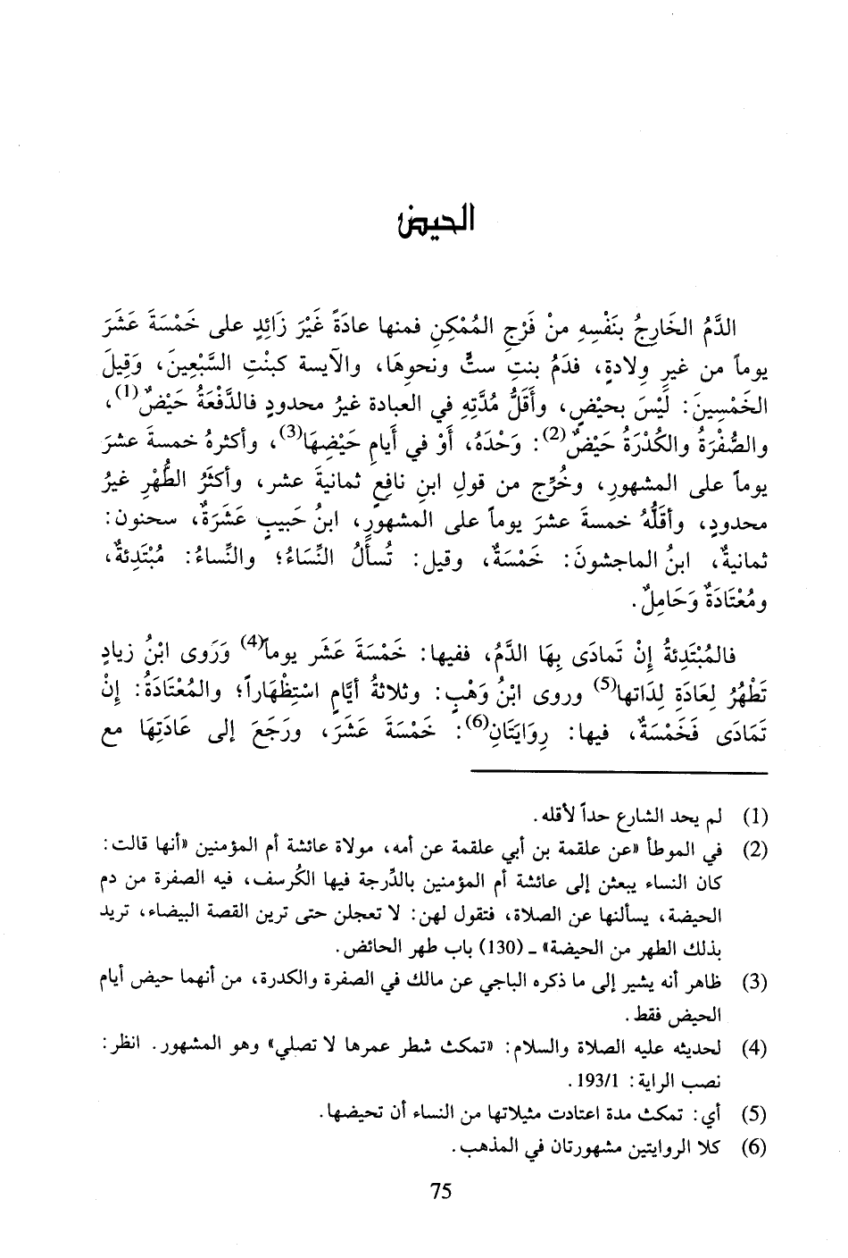 الدَّمُ الْخَارِجُ بِنَفْسِهِ مِنْ فَرْجِ الْمُمْكِنِ فَمِنْهَا عَادَةً غَيْرَ زَائِدٍ عَلَى خَمْسَةَ عَشَرَ يَوْماً مِنْ غَيْرِ وِلادَةٍ، فَدَمُ بِنْتِ سِتٍّ وَنَحْوِهَا، وَالآيِسَةِ كَبِنْتِ السَّبْعِينَ، وَقِيلَ: الْخَمْسِينَ: لَيْسَ بِحَيْضٍ، وَأَقَلُّ مُدَّتِهِ فِي الْعِبَادَةِ غَيْرُ مَحْدُودٍ فَالدَّفْعَةُ حَيْضٌ، وَالصُّفْرَةُ وَالْكُدْرَةُ حَيْضٌ: وَحْدَهُ، أَوْ فِي أَيَّامِ حَيْضِهَا، وَأَكْثَرُهُ خَمْسَةَ عَشَرَ يَوْماً عَلَى الْمَشْهُورِ، وَخَرَجَ مِنْ قَوْلِ ابْنِ نَافِعٍ ثَمَانِيَةَ عَشَرَ، وَأَكْثَرُ الطُّهْرِ غَيْرُ مَحْدُودٍ، وَأَقَلُّهُ خَمْسَةَ عَشَرَ يَوْماً عَلَى الْمَشْهُورِ، ابْنُ حَبِيبٍ: عَشَرَةٌ، سَحْنُونٌ: ثَمَانِيَةٌ، ابْنُ الْمَاجِشُونِ: خَمْسَةٌ، وَقِيلَ: تُسْأَلُ النِّسَاءُ؛ وَالنِّسَاءُ: مُبْتَدِئَةٌ، وَمُعْتَادَةٌ وَحَامِلٌ.