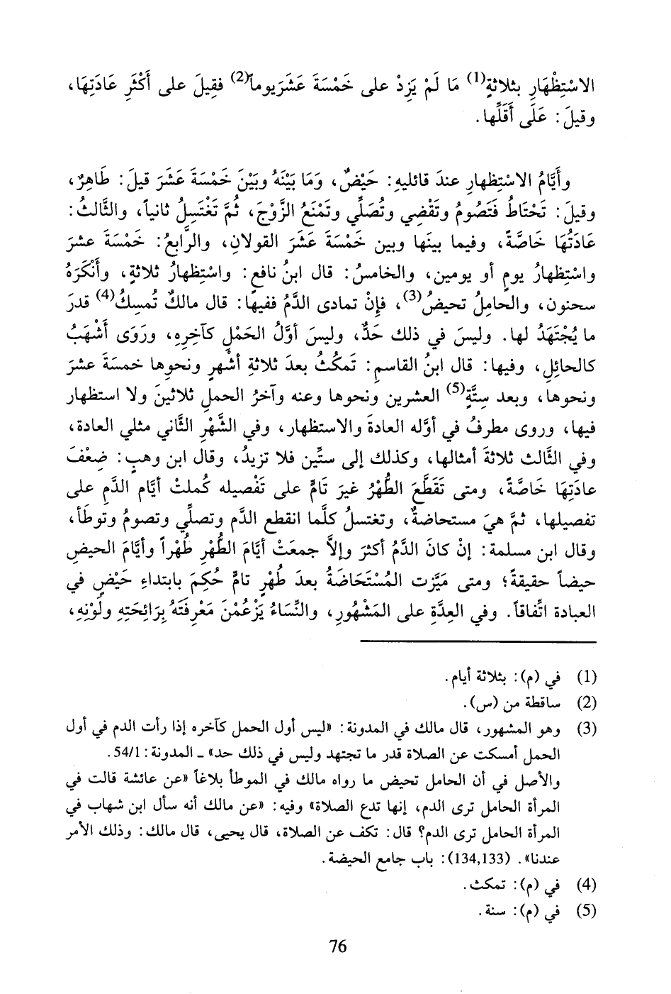 وَلَيْسَ فِي ذَلِكَ حَدٌّ، وَلَيْسَ أَوَّلُ الْحَمْلِ كَآخِرِهِ، وَرَوَى أَشْهَبُ كَالْحَائِلِ، وَفِيهَا: قَالَ ابْنُ الْقَاسِمِ: تَمْكُثُ بَعْدَ ثَلاثَةِ أَشْهُرٍ وَنَحْوِهَا خَمْسَةَ عَشَرَ وَنَحْوَهَا، وَبَعْدَ سِتَّةِ الْعِشْرِينَ وَنَحْوِهَا وَعَنْهُ وَآخِرُ الْحَمْلِ ثَلاثِينَ وَلا اسْتِظْهَارَ فِيهَا، وَرَوَى مُطَرِّفٌ فِي أَوَّلِهِ الْعَادَةَ وَالاسْتِظْهَارَ، وَفِي الشَّهْرِ الثَّانِي مِثْلَيِ الْعَادَةِ، وَفِي الثَّالِثِ ثَلاثَةُ أَمْثَالِهَا، وَكَذَلِكَ إِلَى سِتِّينَ فَلا تَزِيدُ، وَقَالَ ابْنُ وَهْبٍ: ضِعْفَ عَادَتِهَا خَاصَّةً، وَمَتَى تَقْطَعُ الطُّهْرَ غَيْرَ تَامٍّ عَلَى تَفْصِيلِهِ كَمُلَتْ أَيَّامُ الدَّمِ عَلَى تَفْصِيلِهَا، ثُمَّ هِيَ مُسْتَحَاضَةٌ، وَتَغْتَسِلُ كُلَّمَا انْقَطَعَ الدَّمُ وَتُصَلِّي وَتَصُومُ وَتُوطَأُ، وَقَالَ ابْنُ مَسْلَمَةَ: إِنْ كَانَ الدَّمُ أَكْثَرَ وَإِلا جَمَعَتْ أَيَّامَ الطُّهْرَ طُهْراً وَأَيَّامَ الْحَيْضِ حَيْضاً حَقِيقَةً؛ وَمَتَى مَيَّزَتِ الْمُسْتَحَاضَةُ بَعْدَ طُهْرٍ تَامٍّ حُكِمَ بِابْتِدَاءِ حَيْضٍ فِي الْعِبَادَةِ اتِّفَاقاً. وَفِي الْعِدَّةِ عَلَى الْمَشْهُورِ، وَالنِّسَاءُ يَزْعُمْنَ مَعْرِفَتَهُ بِرَائِحَتِهِ وَلَوْنِهِ،