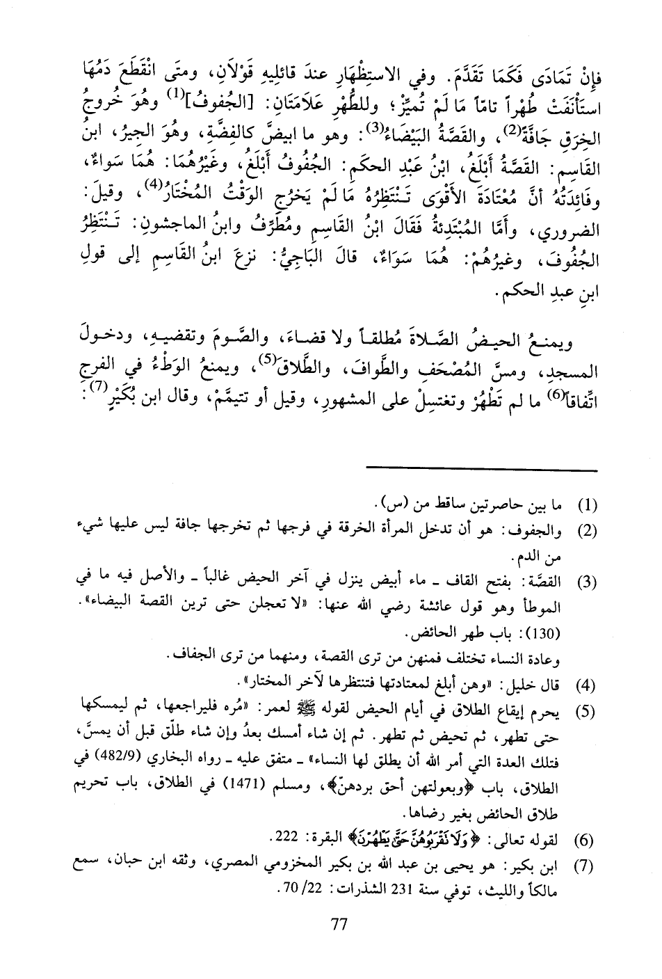 وَفِي الاسْتِظْهَارِ عِنْدَ قَائِلِيهِ قَوْلانِ، وَمَتَى انْقَطَعَ دَمُهَا اسْتَأْنَفَتْ طُهْراً تَامّاً مَا لَمْ تُمَيِّزْ؛ وَلِلطُّهْرِ عَلامَتَانِ: [الْجُفُوفُ] وَهُوَ خُرُوجُ الْخِرَقِ جَافَّةً، وَالْقَصَّةُ الْبَيْضَاءُ: وَهُوَ مَا ابْيَضَّ كَالْفِضَّةِ، وَهُوَ الْجِيرُ، ابْنُ الْقَاسِمِ: الْقَصَّةُ أَبْلَغُ، ابْنُ عَبْدِ الْحَكَمِ: الْجُفُوفُ أَبْلَغُ، وَغَيْرُهُمَا: هُمَا سَوَاءٌ، وَفَائِدَتُهُ أَنَّ مُعْتَادَةَ الأَقْوَى تَنْتَظِرُهُ مَا لَمْ يَخْرُجِ الْوَقْتُ الْمُخْتَارُ، وَقِيلَ: الضَّرُورِيُّ، وَأَمَّا الْمُبْتَدِئَةُ فَقَالَ ابْنُ الْقَاسِمِ وَمُطَرِّفٌ وَابْنُ الْمَاجِشُونِ: تَنْتَظِرُ الْجُفُوفَ، وَغَيْرُهُمْ: هُمَا سُوَاءٌ، قَالَ الْبَاجِيُّ: نَزَعَ ابْنُ الْقَاسِمِ إِلَى قَوْلِ ابْنِ عَبْدِ الْحَكَمِ.
