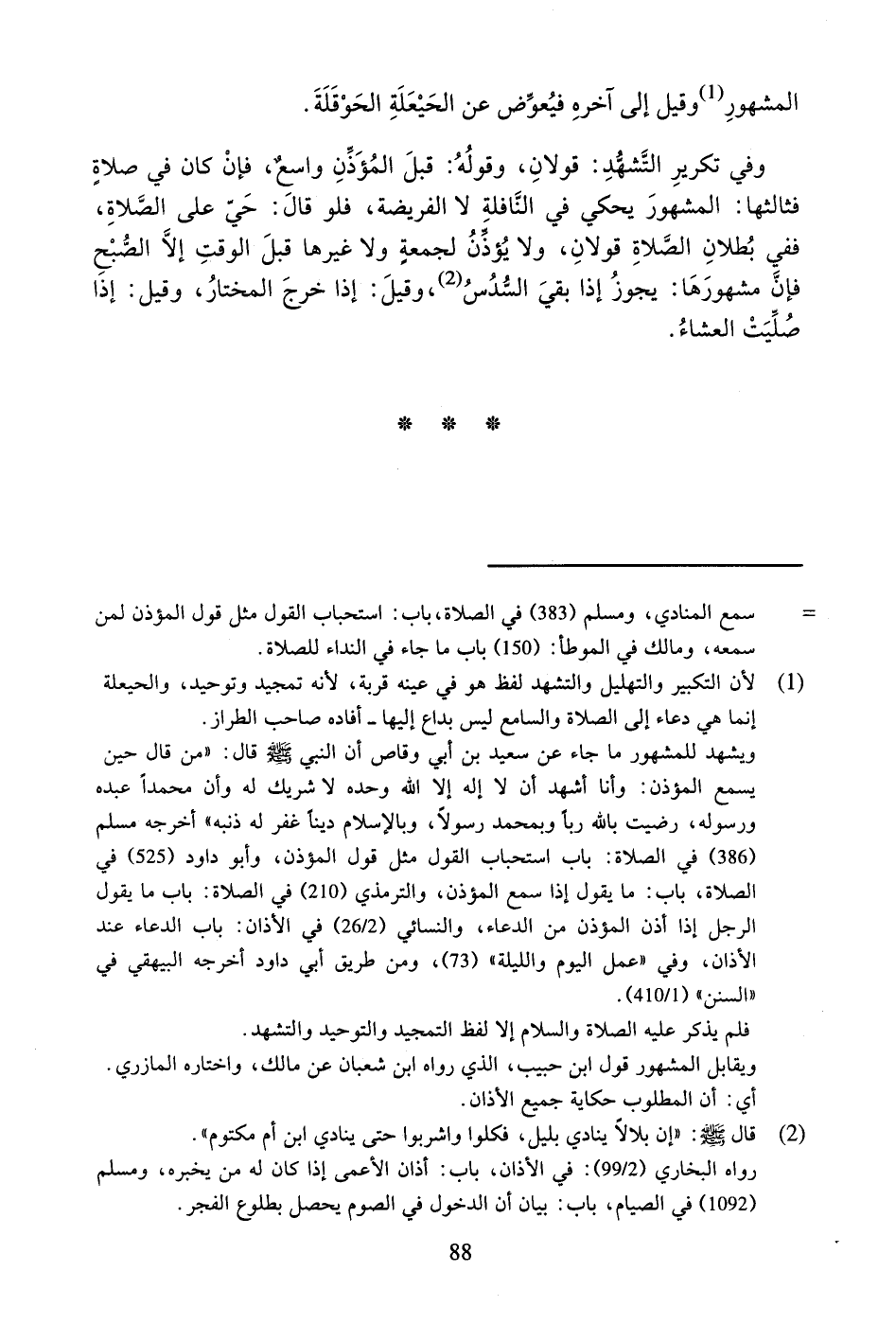 وَفِي تَكْرِيرِ التَّشَهُّدِ: قَوْلانِ، وَقَوْلُهُ: قَبْلَ الْمُؤَذِّنِ وَاسِعٌ، فَإِنْ كَانَ فِي الصَّلاةِ فَثَالِثُهَا: الْمَشْهُورُ يَحْكِي فِي النَّافِلَةِ لا الْفَرِيضَةِ، فَلَوْ قَالَ: حَيَّ عَلَى الصَّلاةِ، فَفِي بُطْلانِ الصَّلاةِ قَوْلانِ، وَلا يُؤَذِّنُ لِجُمُعَةٍ وَلا غَيْرِهَا قَبْلَ الْوَقْتِ إِلا الصُّبْحَ فَإِنَّ مَشْهُورَهَا: يَجُوزُ إِذَا بَقِيَ السُّدُسُ، وَقِيلَ: إِذَا خَرَجَ الْمُخْتَارُ، وَقِيلَ: إِذَا صُلِّيَتِ الْعِشَاءُ.
