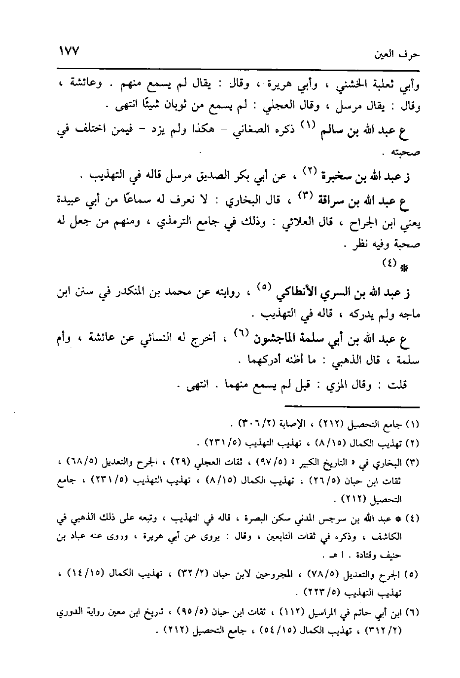 ع عبد الله بن سراقَة قَالَ البُخَارِيّ لَا نَعْرِف لَهُ سَمَاعا من أبي عُبَيْدَة يَعْنِي ابْن الْجراح قَالَ العلائي وَذَلِكَ فِي جَامع التِّرْمِذِيّ وَمِنْهُم من جعل لَهُ صُحْبَة وَفِيه نظر