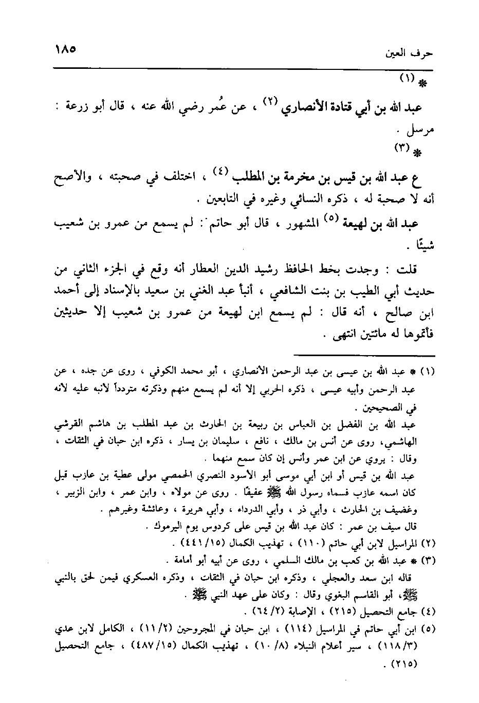 ع عبد الله بن قيس بن مخرمَة بن الْمطلب اخْتلف فِي صحبته وَالأَصَح أَنه لَا صُحْبَة لَهُ ذكره النَّسَائِيّ وَغَيره من التَّابِعين