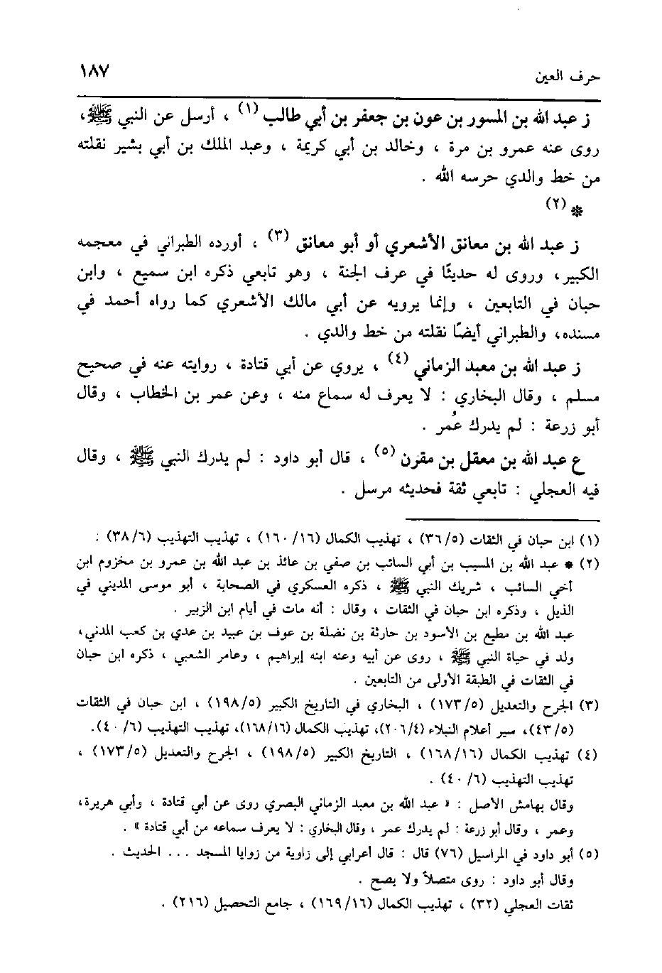 ز عبد الله بن الْمسور بن عون بن جَعْفَر بن أبي طَالب أرسل عَن النَّبِي صلى الله عَلَيْهِ وَسلم روى عَنهُ عَمْرو بن مرّة وخَالِد بن أبي كَرِيمَة وَعبد الْملك بن أبي بشير نقلته من خطّ وَالِدي حرسه الله