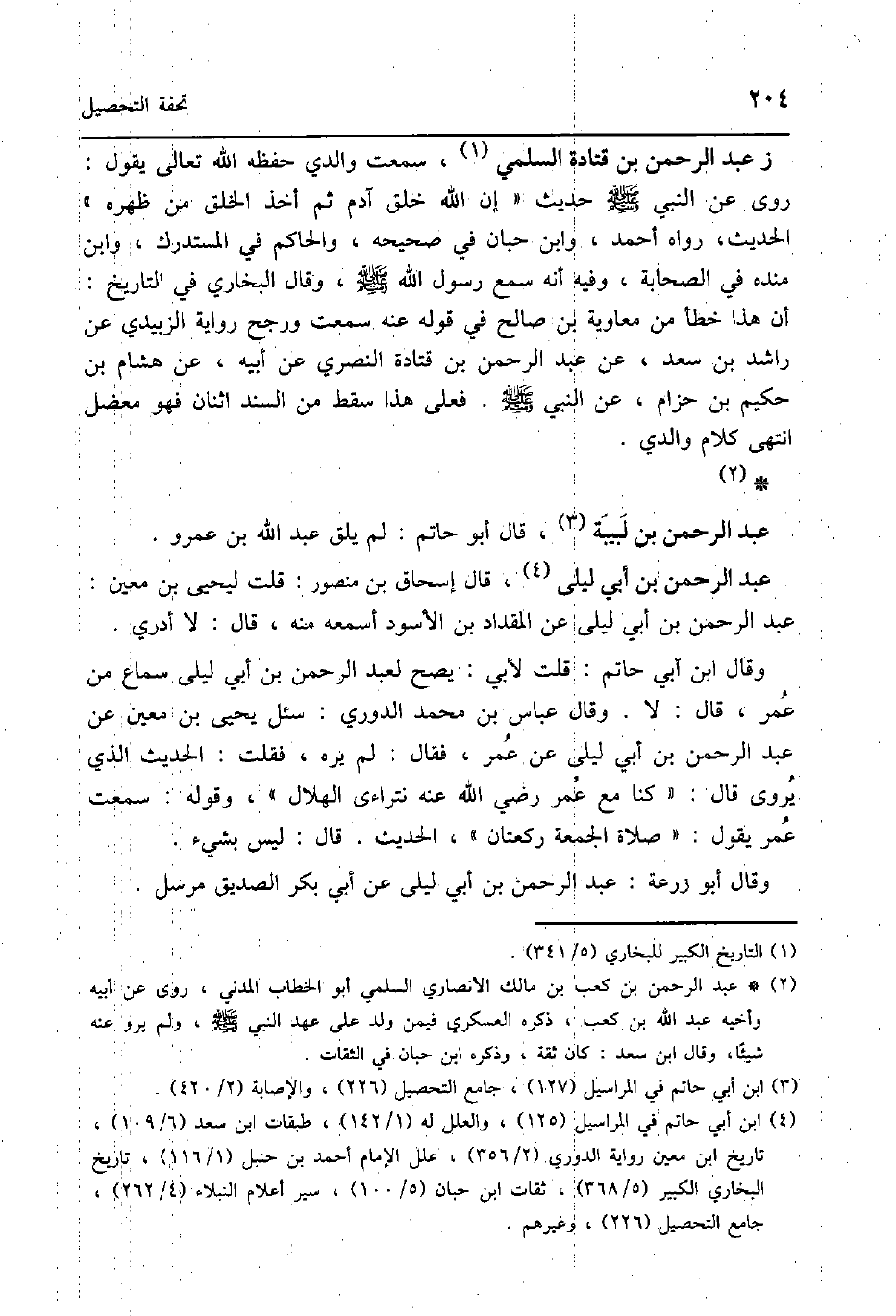 وَقَالَ عَبَّاس بن مُحَمَّد الدوري سُئِلَ يحيى بن معِين عَن عبد الرَّحْمَن بن أبي ليلى عَن عمر فَقَالَ لم يره فَقلت الحَدِيث الَّذِي يرْوى قَالَ كُنَّا مَعَ عمر رَضِي الله عَنهُ نتراءى الْهلَال وَقَوله سَمِعت عمر يَقُول صَلَاة الْجُمُعَة رَكْعَتَانِ الحَدِيث