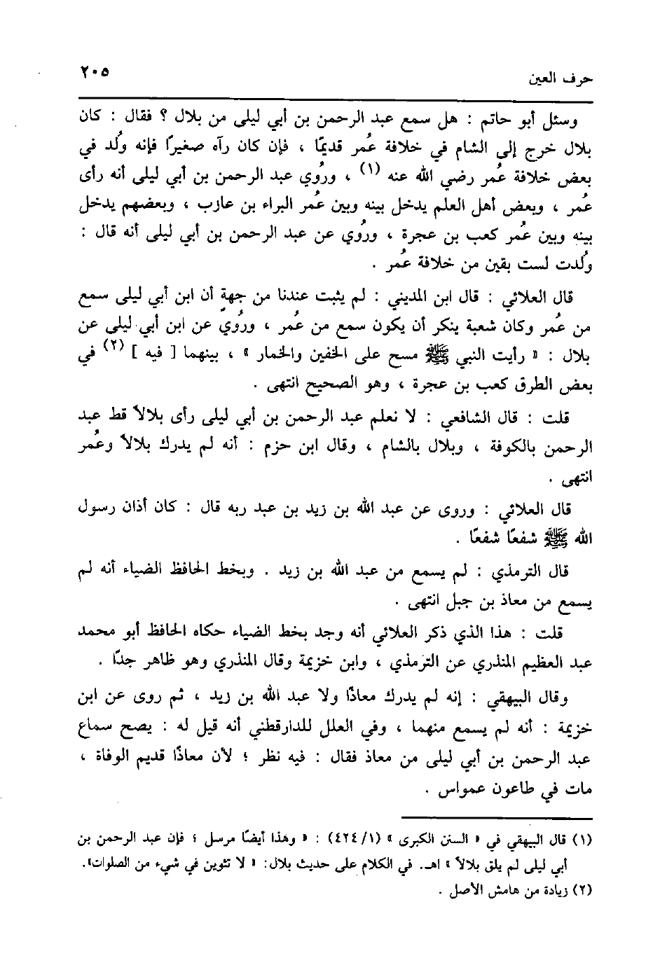 وَسُئِلَ أَبُو حَاتِم هَل سمع عبد الرَّحْمَن بن أبي ليلى من بِلَال فَقَالَ كَانَ بِلَال خرج الى الشَّام فِي خلَافَة عمر قَدِيما فَإِن كَانَ رَآهُ صَغِيرا فَإِنَّهُ ولد فِي بعض خلَافَة عمر رَضِي الله عَنهُ وروى عبد الرَّحْمَن بن أبي ليلى أَنه رأى عمر وَبَعض اهل الْعلم يدْخل بَينه وَبَين عمر الْبَراء بن عَازِب وَبَعْضهمْ يدْخل بَينه وَبَين عمر كَعْب بن عجْرَة وَرُوِيَ عَن عبد الرَّحْمَن بن أبي ليلى أَنه قَالَ ولدت لست بَقينَ من خلَافَة عمر