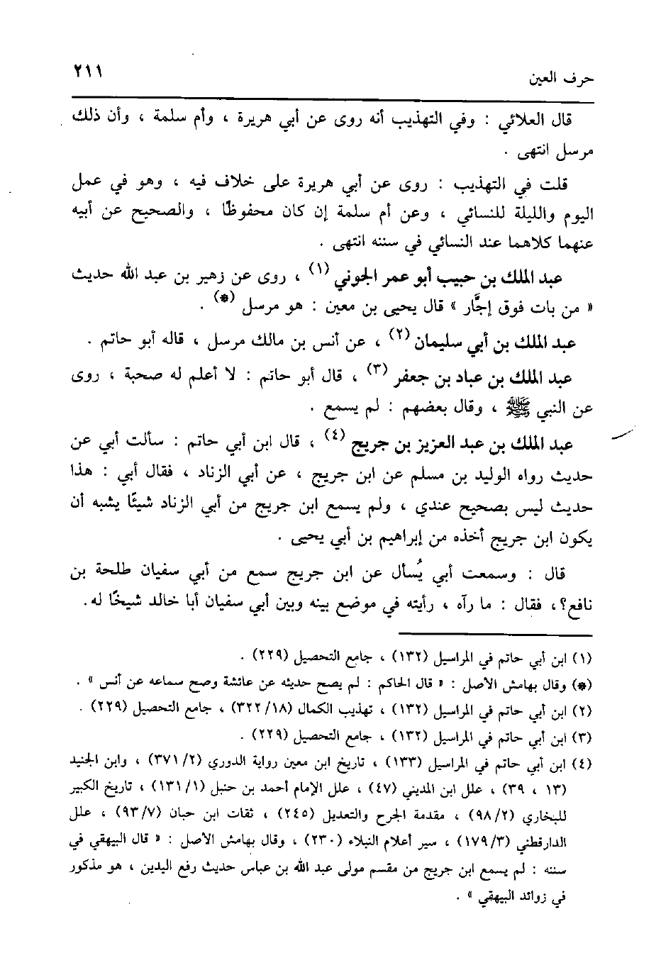 عبد الْملك بن عبد الْعَزِيز بن جريج قَالَ ابْن أبي حَاتِم سَأَلت أبي عَن حَدِيث رَوَاهُ الْوَلِيد بن مُسلم عَن ابْن جريج عَن أبي الزِّنَاد فَقَالَ أبي هَذَا حَدِيث لَيْسَ بِصَحِيح عِنْدِي وَلم يسمع ابْن جريج من أبي الزِّنَاد شَيْئا يشبه أَن يكون ابْن جريج أَخذه من إِبْرَاهِيم بن أبي يحيى