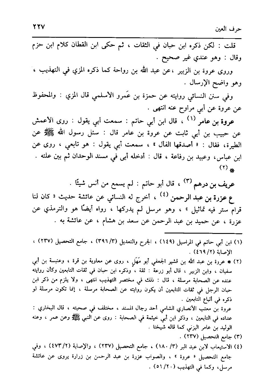 عُرْوَة بن عَامر قَالَ ابْن أبي حَاتِم سَمِعت أبي يَقُول روى الْأَعْمَش عَن حبيب بن أبي ثَابت عَن عُرْوَة بن عَامر قَالَ سُئِلَ رَسُول الله صلى الله عَلَيْهِ وَسلم عَن الطَّيرَة فَقَالَ (أصدقهَا الفأل) سَمِعت أبي يَقُول هُوَ تَابِعِيّ روى عَن ابْن عَبَّاس وَعبيد بن رِفَاعَة قَالَ أدخلهُ أبي فِي مُسْند الوحدان ثمَّ بَين علته