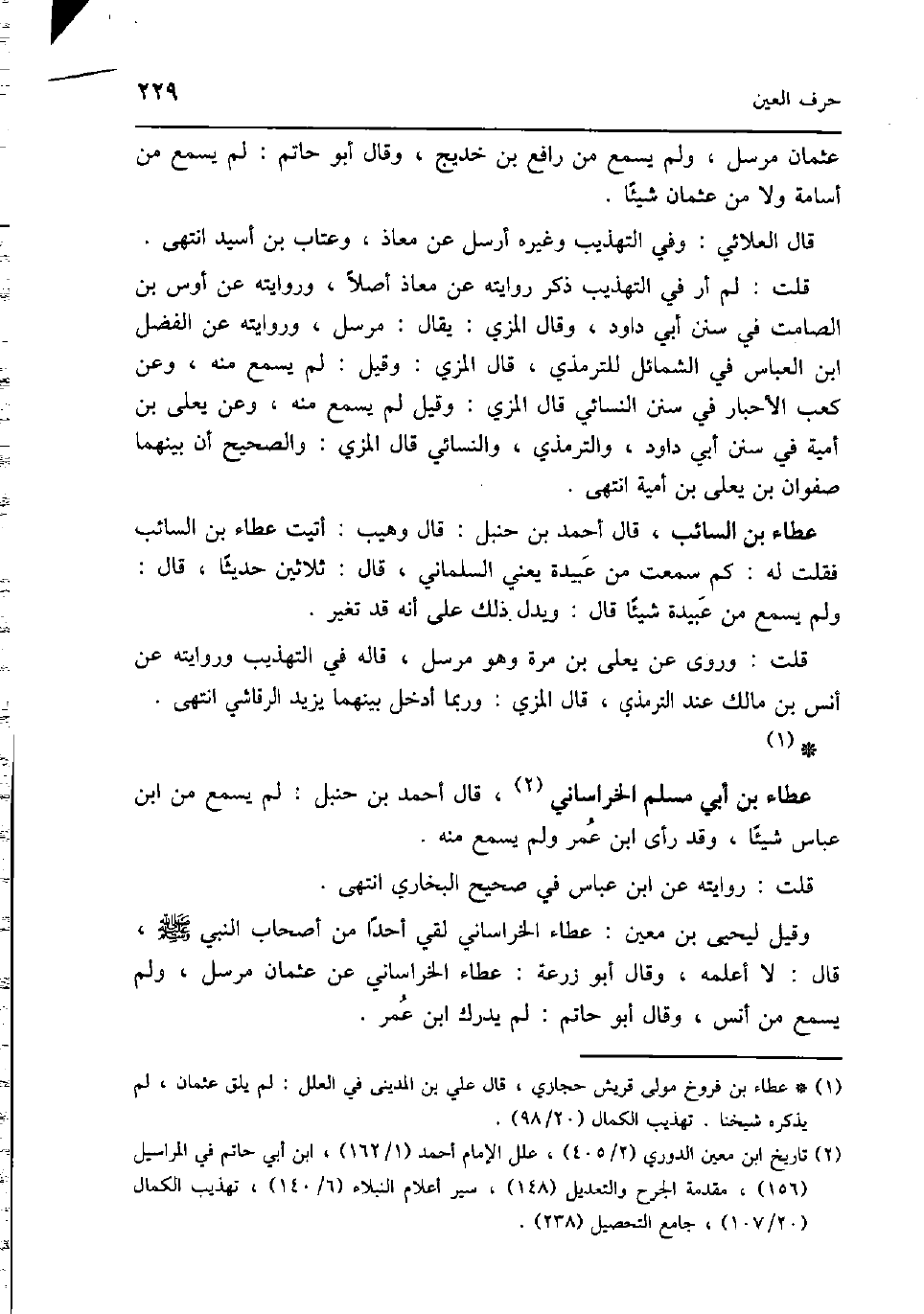 وَقيل ليحيى بن معِين عَطاء الْخُرَاسَانِي لَقِي احدا من أَصْحَاب النَّبِي صلى الله عَلَيْهِ وَسلم قَالَ لَا أعلمهُ وَقَالَ أَبُو زرْعَة عَطاء الْخُرَاسَانِي عَن عُثْمَان مُرْسل وَلم يسمع من أنس وَقَالَ ابو حَاتِم لم يدْرك ابْن عمر
