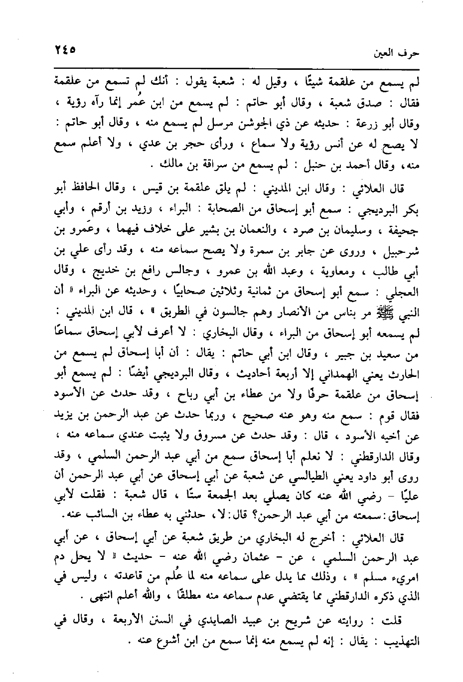 قَالَ العلائي وَقَالَ ابْن الْمَدِينِيّ لم يلق عَلْقَمَة بن قيس وَقَالَ الْحَافِظ أَبُو بكر البرديجي سمع أَبُو إِسْحَاق من الصَّحَابَة الْبَراء وَزيد بن أَرقم وَأبي جُحَيْفَة وَسليمَان بن صرد والنعمان بن بشير على خلاف فيهمَا وَعَمْرو بن شُرَحْبِيل وروى عَن جَابر بن سَمُرَة وَلَا يَصح سَمَاعه مِنْهُ وَقد رأى عَليّ بن أبي طَالب وَمُعَاوِيَة وَعبد الله بن عَمْرو وجالس رَافع بن خديج وَقَالَ الْعجلِيّ سمع ابو إِسْحَاق من ثَمَانِيَة وَثَلَاثِينَ صحابيا وَحَدِيثه عَن الْبَراء ان النَّبِي صلى الله عَلَيْهِ وَسلم مر بناس من الْأَنْصَار وهم جالسون فِي الطَّرِيق قَالَ ابْن الْمَدِينِيّ لم يسمعهُ أَبُو إِسْحَاق من الْبَراء وَقَالَ البُخَارِيّ لَا أعرف لأبي إِسْحَاق سَمَاعا من سعيد بن جُبَير وَقَالَ ابْن أبي حَاتِم يُقَال ان أَبَا إِسْحَاق لم يسمع من الْحَارِث يَعْنِي الْهَمدَانِي الا أَرْبَعَة أَحَادِيث وَقَالَ البرديجي ايضا لم يسمع أَبُو إِسْحَاق من عَلْقَمَة حرفا وَلَا من عَطاء بن أبي رَبَاح وَقد حدث عَن الْأسود فَقَالَ قوم سمع مِنْهُ وَهُوَ عَنهُ صَحِيح وَرُبمَا حدث عَن عبد الرَّحْمَن بن يزِيد عَن اخيه الْأسود قَالَ وَقد حدث عَن مَسْرُوق وَلَا يثبت عِنْدِي سَمَاعه مِنْهُ وَقَالَ الدَّارَقُطْنِيّ لَا نعلم أَبَا إِسْحَاق سمع من أبي عبد الرَّحْمَن السّلمِيّ وَقد روى أَبُو دَاوُد يَعْنِي الطَّيَالِسِيّ عَن شُعْبَة عَن أبي إِسْحَاق عَن أبي عبد الرَّحْمَن ان عليا رَضِي الله عَنهُ كَانَ يُصَلِّي بعد الْجُمُعَة سِتا قَالَ شُعْبَة فَقلت لأبي اسحاق سمعته من أبي عبد الرَّحْمَن قَالَ لَا حَدثنِي بِهِ عَطاء بن السَّائِب عَنهُ