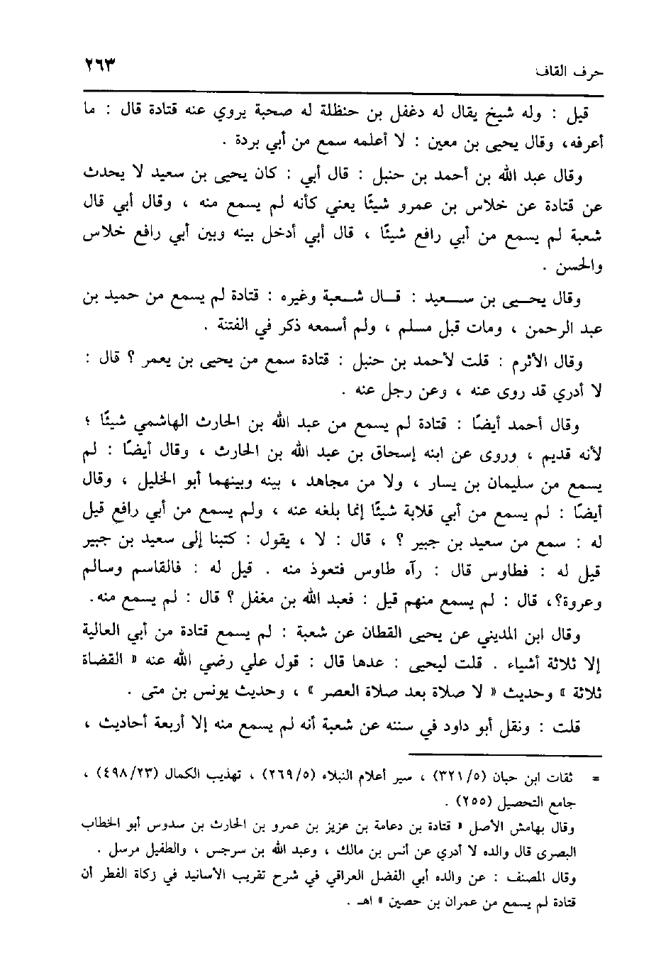 وَقَالَ احْمَد ايضا قَتَادَة لم يسمع من عبد الله بن الْحَارِث الْهَاشِمِي شَيْئا لِأَنَّهُ قديم وروى عَن ابْنه إِسْحَاق بن عبد الله بن الْحَارِث وَقَالَ أَيْضا لم يسمع من سُلَيْمَان بن يسَار وَلَا من مُجَاهِد بَينه وَبَينهمَا أَبُو الْخَلِيل وَقَالَ أَيْضا لم يسمع من أبي قلَابَة شَيْئا وَإِنَّمَا بلغه عَنهُ وَلم يسمع من أبي رَافع قيل لَهُ سمع من سعيد بن جُبَير قَالَ لَا يَقُول كتبنَا الى سعيد بن جُبَير قيل لَهُ فطاوس قَالَ رَآهُ طَاوس فتعوذ مِنْهُ